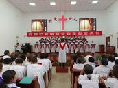 上午10:00献堂典礼正式开始。来自内蒙古西部40多位牧长身穿圣服伴随着《主在圣殿中》的乐曲依次进入圣殿。
