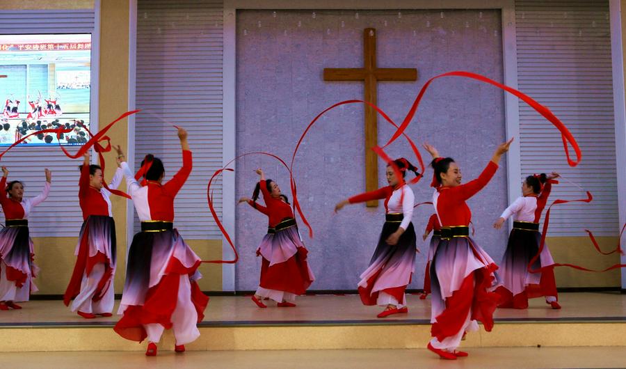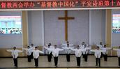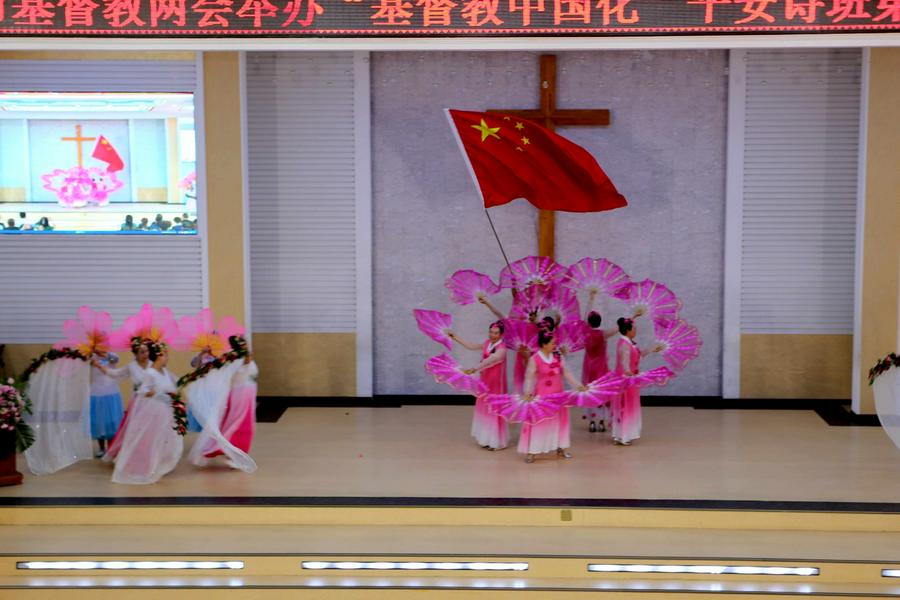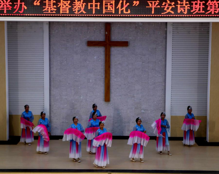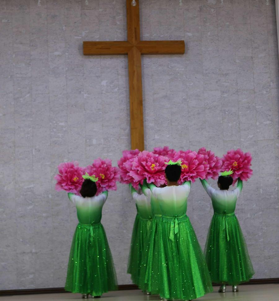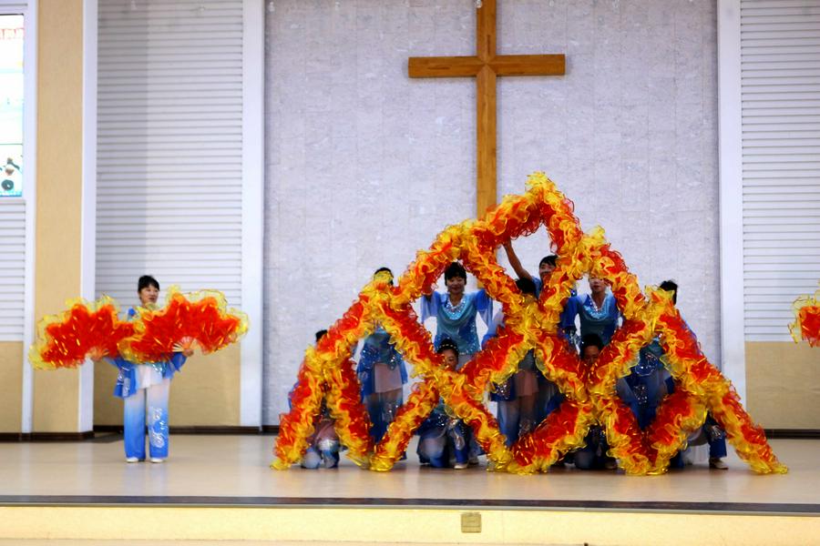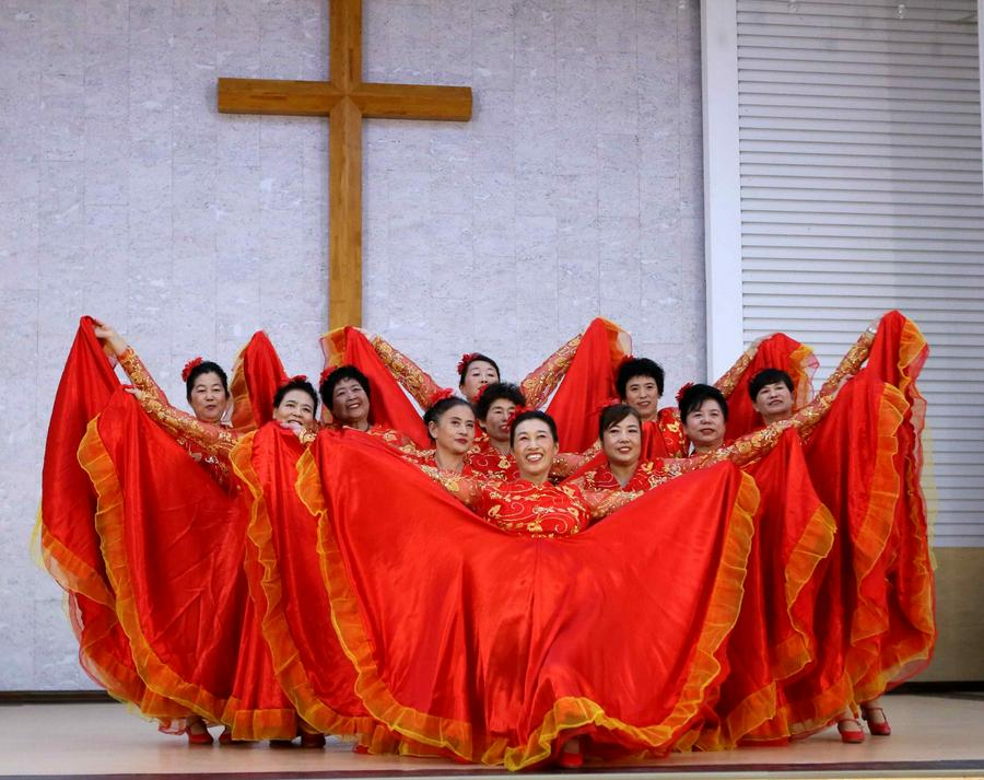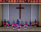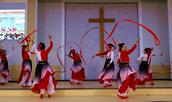 在全体起立高唱《国歌》后,首先出场的不是主持人,而是大石桥基督教会的开场舞《祝福我的中华》。只见五星红旗猎猎,弟兄姊妹在音乐声中舞起来,变换着舞姿和队形,红色的、白色的、蓝色的、粉色的,多姿多彩的舞蹈赢得了全场弟兄姊妹们的热烈掌声、喝彩,这开场舞一下子就点出了今天的主题:基督教中国化。而且一下子就带来了今天的舞蹈联谊会的高潮。