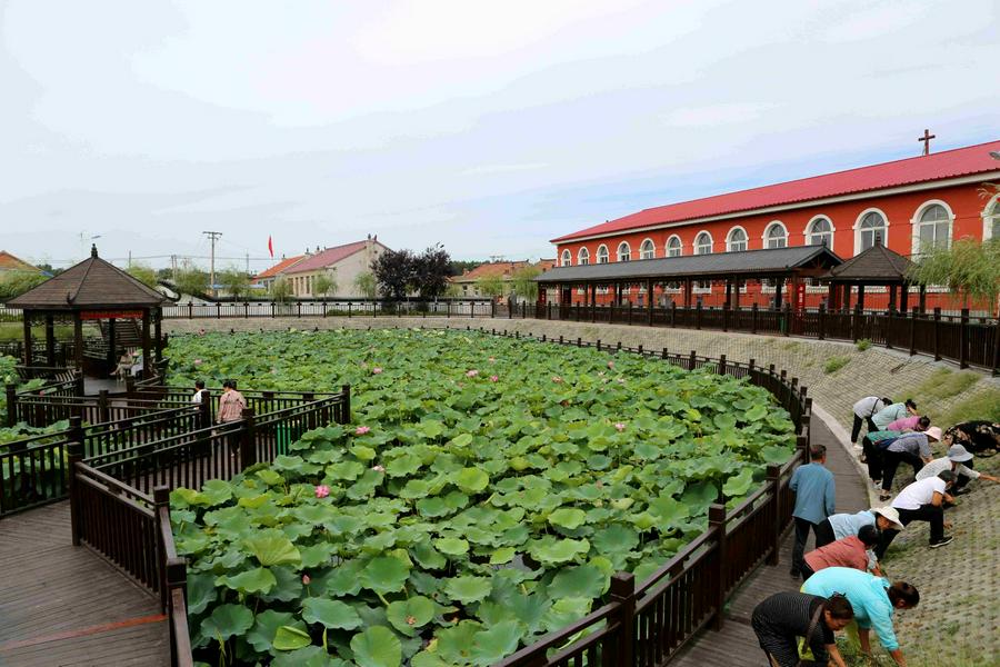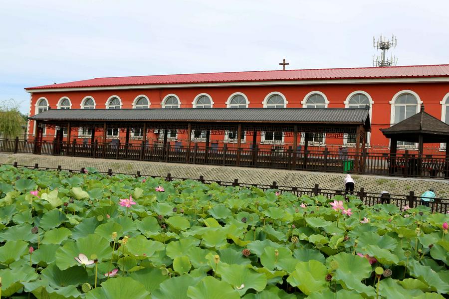 我惊喜的发现:教堂的后面是几十亩、长约1000米的著名打卡风景区——东王庄荷花塘。“道路修得宽,人人都喜欢。路灯明又亮,百姓心敞亮。广场音乐响,跳出新气象。乡村环境大变样,生态宜居美名扬。”这是东王庄村民赞扬这里的“顺口溜”,而新恩堂就在这风景区的中心。