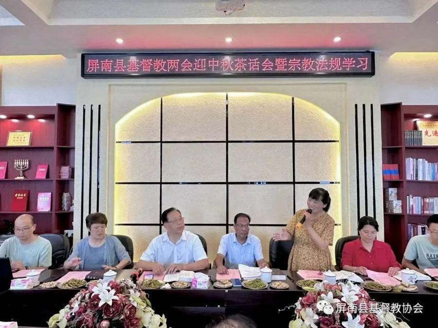 9月22日,在中秋、国庆双节来临之际,福建省屏南县基督教两会在屏南城东基督堂四楼会议室开展“迎中秋·庆国庆”茶话会暨宗教法规学习会,组织县基督教两会常委、专职教牧人员、牧区长学习宗教政策法规。屏南县民族与宗教事务局局长陈发杨先生受邀出席会议。