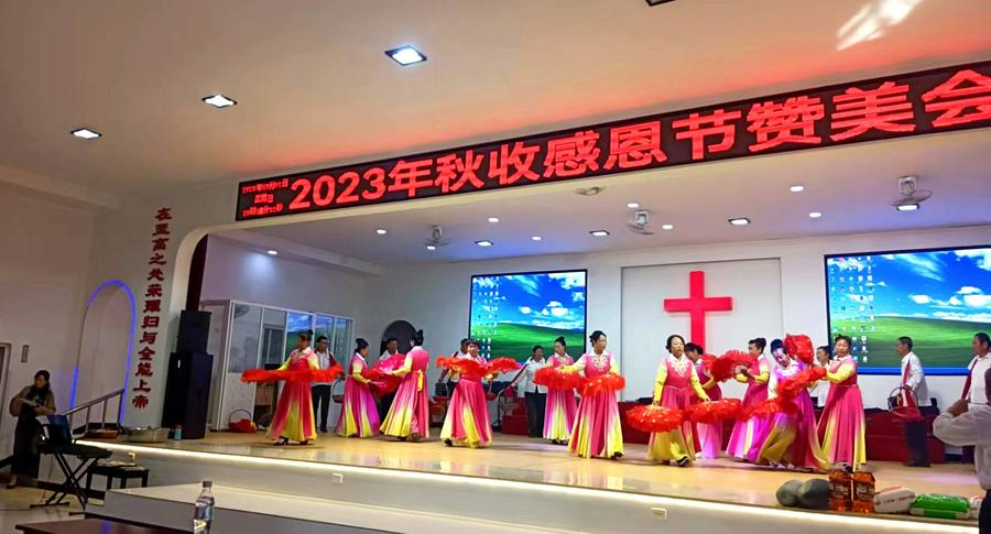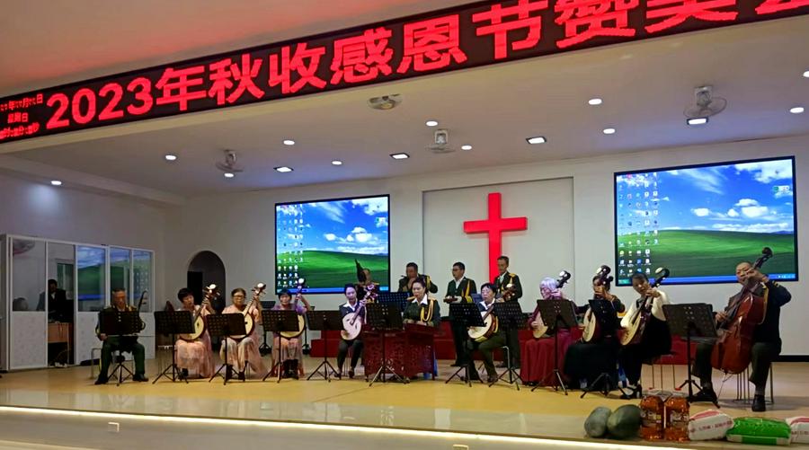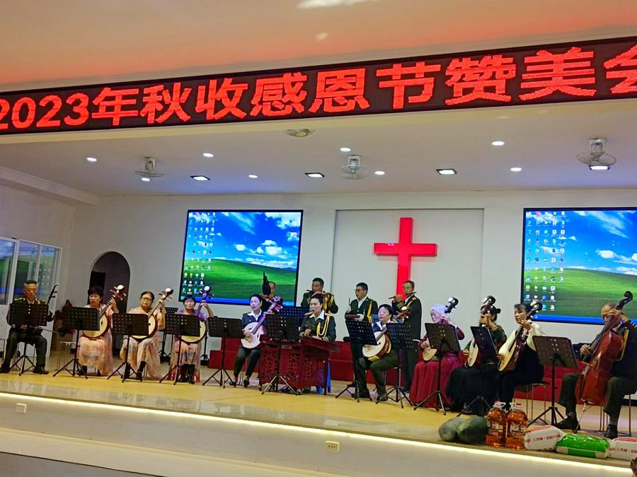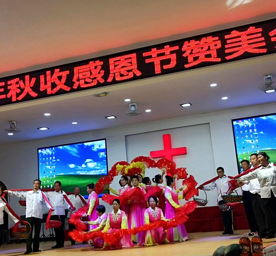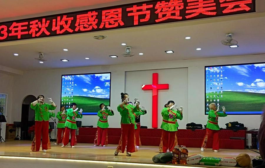 教会负责人徐立平弟兄带头以歌声赞美三一的真神上帝所赐的秋成收获、四季平安,他那醇厚高昂动听的赞美歌声获得大家热烈掌声,荣耀归于神;今年84岁的白殿福弟兄以感恩的心情献上葫芦丝独奏《八方的赞美》和独舞《中国大有希望》;姊妹的翩翩起舞,如同一幅流动的水墨画,优美而富有诗意;乐队的演奏充满了圣灵的感动,具有激情与活力,每一个音符都仿佛在跳跃着,让人感受到无尽的动力。