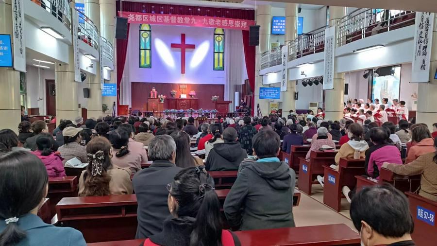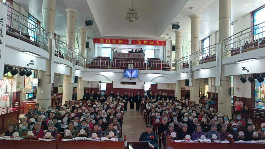 当天早上,艳阳高照,蓝天白云令人心旷神怡 。来自城区各处的老人从四面八方赶来。接待人员热情接待搀扶,为老信徒胸口别上了大红花,教堂里装饰一新,洋溢着欢乐祥和的气氛。在教唱人员的带领下,赞美的歌声充满圣殿。