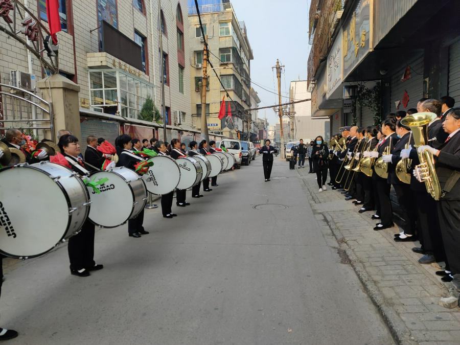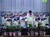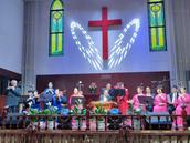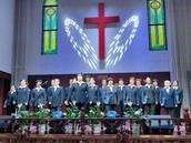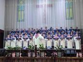 五层教堂巍然耸立,顶上的大红十字架熠熠生辉,映衬于金秋时节的蓝天白云,更显风姿。一大早,大家满怀喜悦前往圣殿,早有接待人员在热情迎接,给人以到家的感觉,正像诗篇122篇所说“人对我说,我们往耶和华的殿中,我就喜欢”的美好情景。由30多人组成的联合乐队列队齐奏,鼓声铿锵,号声嘹亮,上达云霄。