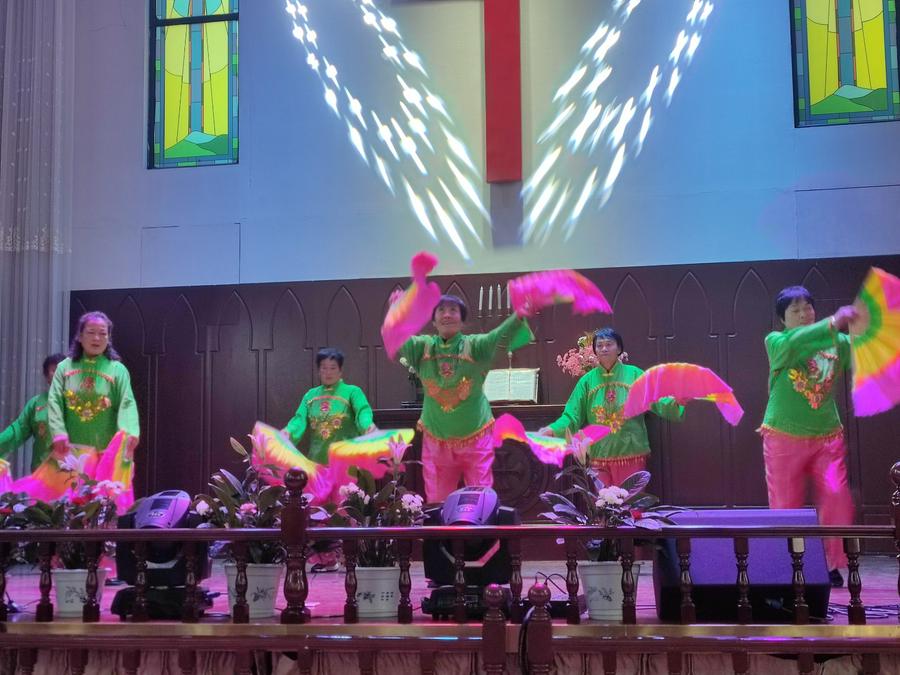 王帅传道主持了文艺节目的演出。教会诗班和各堂点精心装扮的弟兄姊妹轮番登场,表演精心预备的节目。舞蹈《走进恩典时代》《美好的圣殿》《十个童女迎新郎》《丰收的季节》,翩翩舞姿,抒发爱主感恩之情;十五人组成的中西结合的器乐合奏《献堂感恩歌》《神工妙笔》,余音绕梁令人陶醉;独具特色的背诵经文,流利的背诵,使人共同感受诗篇的美好韵味;各个堂点纷纷献唱了诗歌。五一路活动点的93岁老执事李海花、黄芝兰,坚持抄写全本圣经的李素兰姊妹,胸怀使命、帮助山区教会的张建珍姊妹,忠心服侍做工、蒙神恩典祝福的的马三平姊妹分享了自己的感恩见证。杨森林牧师做祝福祷告。