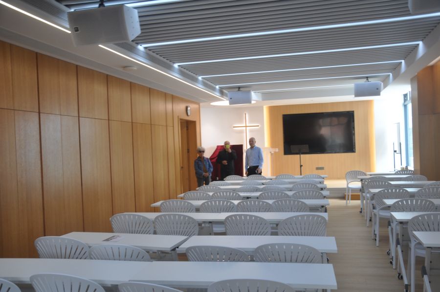 据介绍,整个圣殿可容700余人之众,12.7米高的大堂后面分上下两层,整个建筑风格由外向内无不彰显其包容与博大,圣台上的深咖色十字架十分醒目,向万民诉说着耶稣基督的救赎和恩典。这些都与圣殿圣台浑然一体,信徒走进殿堂就感受到这里有神的同在!