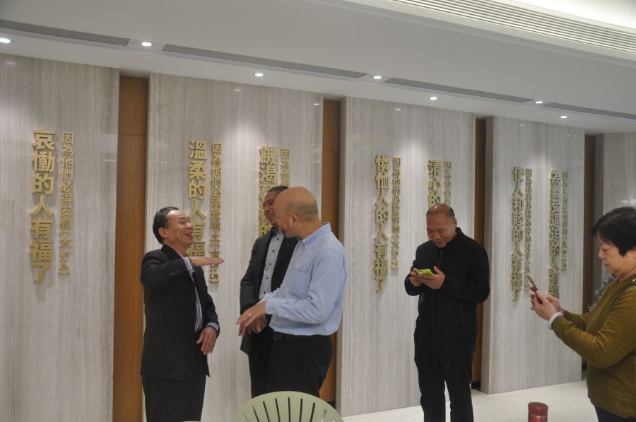 在张副主任引导下,我们从教堂无障碍入口走进迎宾“八福”大厅,电视大屏播放美妙赞美诗……前来接迎我们的林亮光牧师热情地与和我们进行了合影。