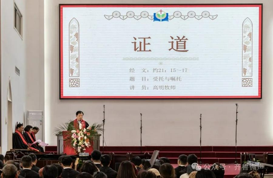 圣职按立崇拜分别由张建顺牧师和王孟坤牧师主礼,王伟牧师、张永胜牧师、邵永田牧师分别读经,刘宗昌牧师举荐,高明牧师证道。他以“受托与嘱托”为题勉励接受圣职同工,接受主的托付就要按照主的嘱托喂养好神的羊群,以基督的真理看顾及守护他们,竭力作基督圣言和圣事的忠心仆人。