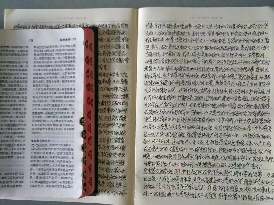 她对于疾病想得开,对于后事也是做了安排。告诉家人不要打扰其他人,后事按照信仰办,一切从简。因为她是一位虔诚的基督徒,因为她多年在教会服侍。她是一位多才多艺的姊妹:会作曲、会跳舞,并且在社会的专业团做过演员;她会中阮、大提琴、架子鼓等乐器;她会写诗歌、写见证,文笔不错。“一粒种子破土,就有了生机!神说:“地要发生青草和结种子的菜蔬,并结果子的树木,各从其类,果子都包着核。”事就这样成了。(创世记1章11节)新的生命从春天开始!”这是石萍姊妹2022年3月20日在福音时报发表文章的片段,她的多篇文章在福音时报上发表。在她病重期间还坚持每天抄写圣经,终于在去年抄写完毕,由她丈夫恩东弟兄送到教会,袁明牧师看过之后为她点赞,还送给她一本新的圣经。她和我说,这本手抄圣经留给她的女儿……