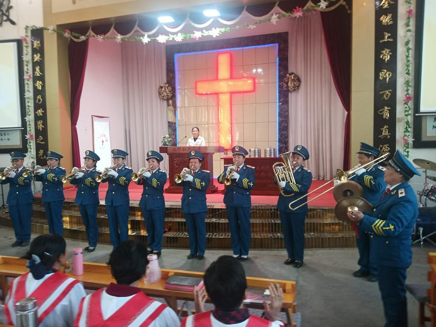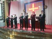 接下来是本堂第一诗班登台献唱,向主献唱了《满山的小羊》《立志跟你走永远》两首诗歌。紧接着圣乐队大鼓“咚咚”敲响,只见乐队弟兄姊妹们手执萨克斯激昂吹响乐号,向主献上了《虔诚的心献给主》《送给主》两首赞美旋律。
