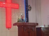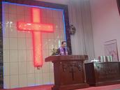 上午9:50开始的第一堂证道,由本堂范友谊传道分享。在开场白中,他面对台下会众,即兴朗诵起康熙皇帝诗作:“功成十架血成溪,百丈恩流分自西。身列四衙半夜路,徒方三背两番鸡。五千鞭挞寸肤裂,六尺悬垂二盗齐。惨恸八埃惊九品,七言一毕万灵啼。”然后带领大家齐唱了《他把我从泥坑拉出》诗歌。接下来范弟兄围绕主题“十架七言”,用了一个多小时,讲了第一部分:“父啊,赦免他们!因为他们所做的不晓得”。在证道过程中,他详细阐述了十架七言第一言的三个方面:1. 不认识主基督是荣耀的主;2. 不明白神的大爱;3. 不晓得罪恶的可怕。