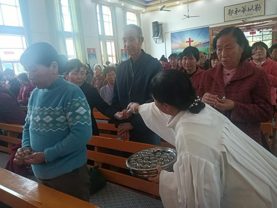 上午11:20,圣餐礼正式开始。主堂两侧大屏幕上配着音乐放映起耶稣身背十字架一步步走向各各他的视频画面。这时有一姊妹端上一盆热水,范长老与分发圣餐的七位姊妹依次净手。然后范长老在圣桌上掰碎盘子中的饼,高举圣盘祈祷后,将代表耶稣身体的饼盘递到台前七位姊妹手中,再由姊妹端盘分别行走于主堂四条通道,把盘中的饼依次分发给全体会众。在范长老带领下,大家在同一时间共同吃下了这代表耶稣身体的饼。
