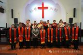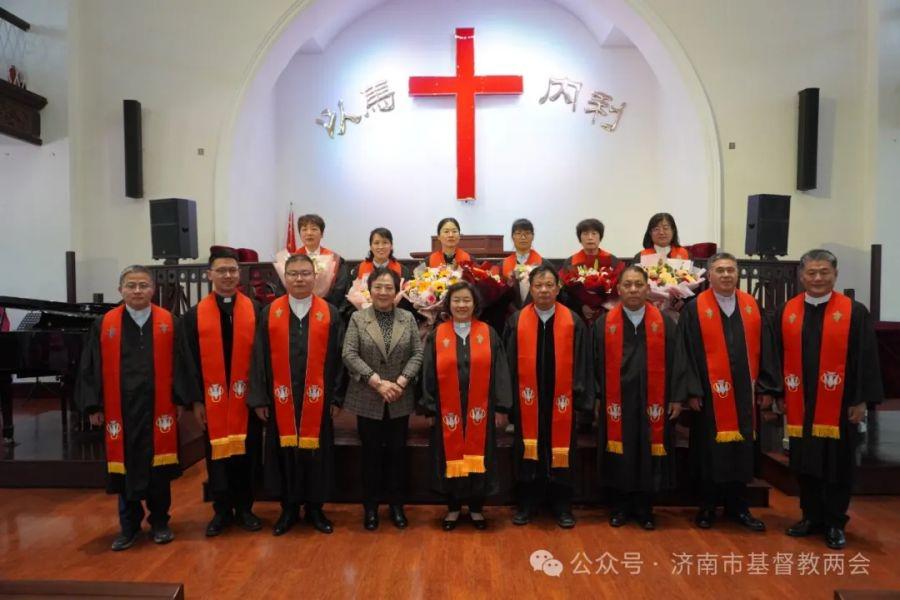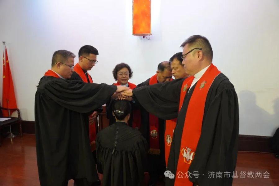 山东省基督教三自爱国运动委员会主任董美琴牧师,山东省基督教协会会长高明牧师,山东省基督教三自爱国运动委员会副主任、济南市基督教三自爱国运动委员会主任赵克玉同工,山东省基督教协会副会长王孟坤牧师,山东省基督教协会总干事卞荣亮牧师,山东省基督教两会副秘书长副总干事、济南市基督教协会会长段国山牧师,济南市基督教两会副主任副会长兼秘书长马小文牧师,济南市基督教协会副会长兼总干事梁川长老组成圣职按立团,6位同工被按立为牧师、长老,济南部分区县的教牧同工、经四路教堂信徒及部分按立同工家属见证了这一圣礼。