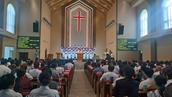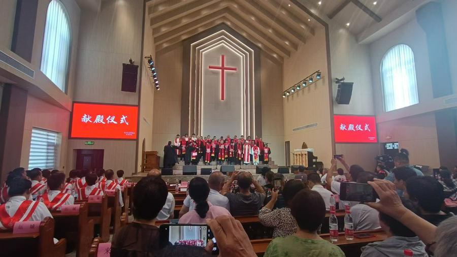 上午十时,献堂感恩崇拜开始,教堂里座无虚席。永济市基督教会李大卫牧师主礼。在殿乐声中,数十人的诗班列队登台。紧接着,圣乐队奏响了圣乐,鼓乐齐鸣。然后,大家齐颂《圣哉三一歌》、共颂主祷文、歌诗《称谢歌》。