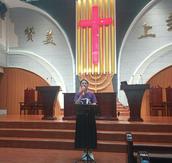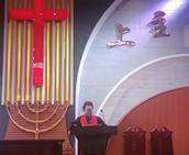 再次,当今天证道临近结束时,易长老提议全体会众起立,由她在台上举手启应领祷,会众台下举起右手回应齐祷,共同进行曙光教会殿庆七周年感恩宣告祷告: