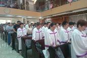 看啊,当第一束曙光从东方群山塬畔升起时,宝鸡曙光堂也已早早醒来。教会院子西头厨房已是炊烟缭绕灯火通明,那是马大组弟兄姊妹在忙碌地准备今天午餐。院子东西两侧铁栅门也已趟开,身着紫色曙光堂标志服的接待姊妹们,列队在教堂门口及南广场东西路口,恭候迎接前来参加殿庆活动的来宾。听啊,时间刚刚到了8:00,曙光教会主副堂已分别传出嘹亮的赞美歌声,那是在二楼主堂白姊妹正在给早到的姊妹弟兄教唱《我爱教会歌》,一楼副堂里诗班弟兄姊妹也正在练唱今天的献唱赞美诗歌……