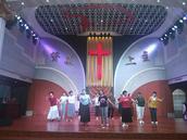 上午11:30,证道结束后,在陈剑弟兄继续主持下,开始了七周年殿庆首场感恩赞美演出。首场登台演出的是曙光教会诗班,两位弟兄两位姊妹手捧蓝色诗夹,满怀对主的感恩之情,声情并茂朗诵了《感恩献词》。他们时而语调缓慢抒情婉转,诉说着曙光儿女走过的30多年艰辛历程,时而声音激昂表达着献殿时的喜乐和这殿的荣耀。接下来是北片区的《感恩》合唱,老年诗班带来的的情景剧《爱的牵手》紧跟登场,诗班舞蹈《撒玛利亚打水》美轮美奂画龙点睛,《四个老婆信耶稣》诙谐有趣笑声连连,西片区情景剧《当有的品格》引得满场喝彩掌声点赞!