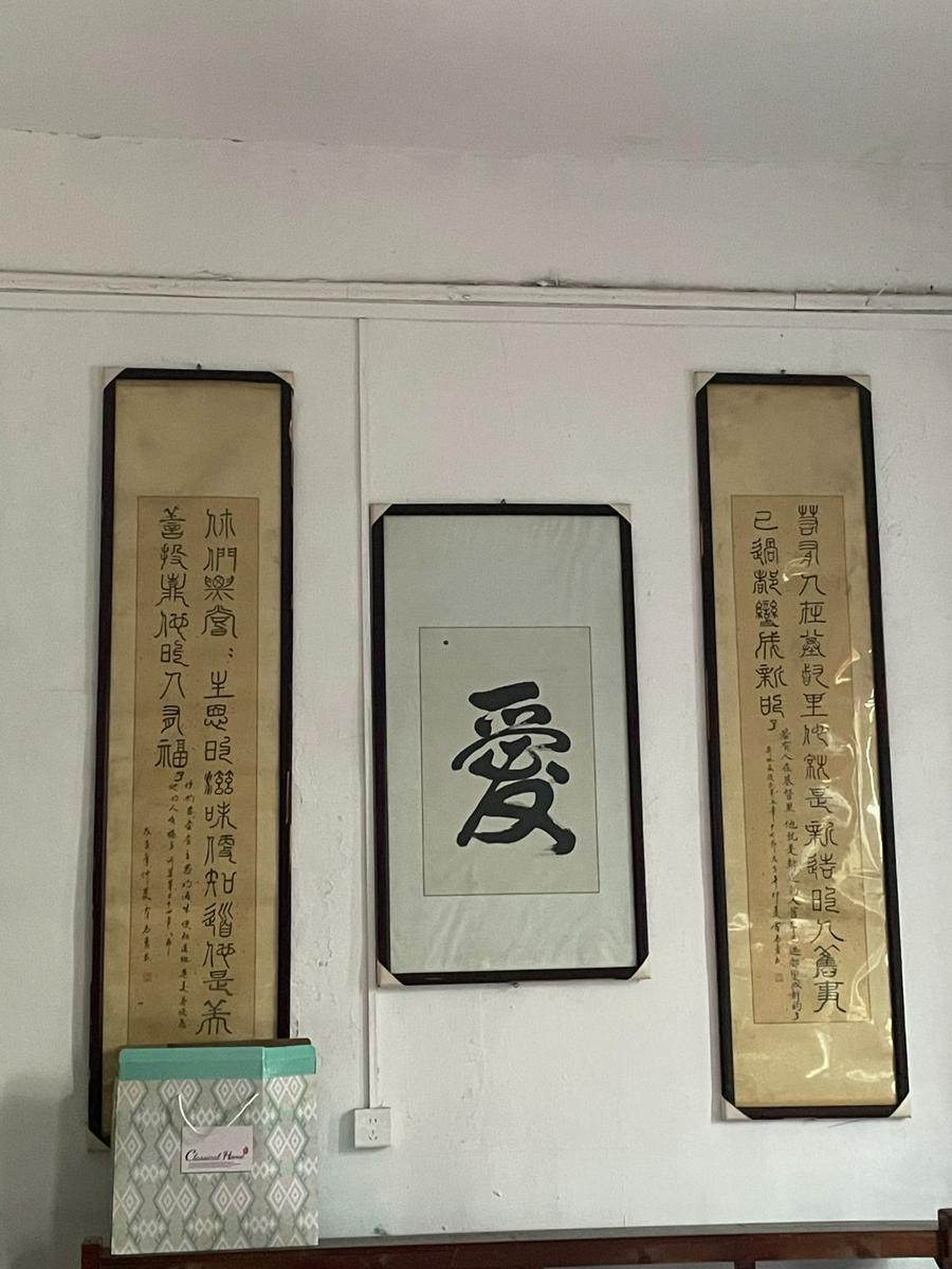 扶着古朴的扶手,沿着已磨得掉漆的楼梯拾级而上,每一步都踏出历史的回响。二楼是当时传教士接待和休息的地方,那古老的字画已经泛黄,屏风也已经破损,虽失去往日的华丽,却更添几分历史的韵味。挂在墙壁上的“爱”字以及耶稣像,依然在诉说那无尽的大爱和救赎的恩典。