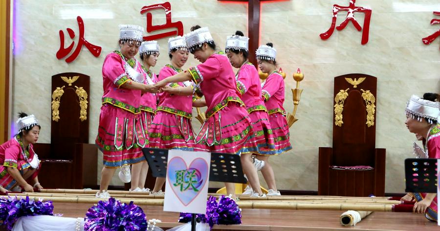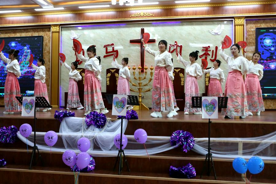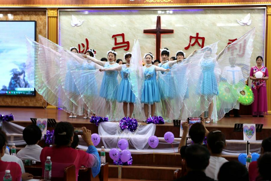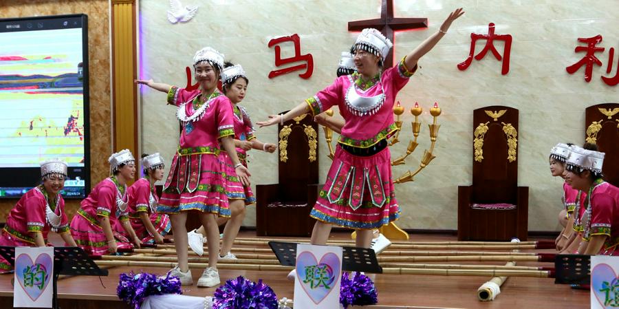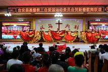 大台教会的《贞洁的童女等候新郎》,声情并茂地表达了信徒安静等候主的到来,台上饰演童女的姊妹感动的落泪了、台下有的弟兄姊妹也感动的落泪了;胜利教堂表现夫妻和睦、家庭幸福的夫妻舞蹈《无言的爱》,赢得了会场信徒的阵阵掌声和笑语;达牛教会《我们是一只赞美的军队》、《教会啊你要兴起》等舞蹈,铿锵有力、轻歌曼舞,是全场最靓丽的风景线;胜利教堂身着少数民族服装的《黑与白》竹竿舞特别引人注目,只见台上竹竿有节奏地合击与分开,姊妹们在分合的瞬间跳竿者在竹竿之间敏捷地进退跳跃,有时还会潇洒、自然地做各种优美的动作;新华教会的歌伴舞,有两位弟兄歌唱、姊妹翔舞,获得好评;还有黄沙、达牛俩位有专业水准的年轻姊妹领舞……富家、黄沙、桑林、桓洞、新华、湘水等各基督教活动场所献上的赞美诗歌表演如同一场视觉盛宴,他们的身体语言讲述着一个又一个美丽的故事,引人入胜如同心灵的乐章,呈现给圣三一的真神上帝面前、展现在现场的信徒面前。这些节目不仅展现了基督教徒对祖国的热爱,更彰显了他们对信仰的坚守与对神的敬畏之心。