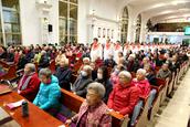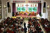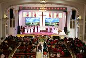 在教会的圣殿里,坐满了前来参加赞美聚会的肢体和慕道友,大家在喜乐的氛围中跟随诗班赞美敬拜。