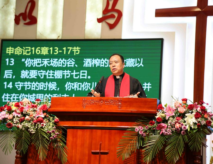 在诗班的颂赞中,身着圣服的张学军牧师登上圣台,问候弟兄姊妹丰收节喜乐、在基督里蒙恩,并为主证道。他着重讲了感恩节的意义和圣洗礼的重要性,他的话语给了信徒和即将受洗的弟兄姊妹智慧和启迪,使在场的每一位信徒都深受感动。