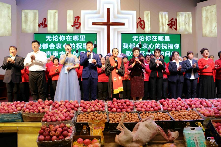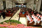 今天的赐福堂,圣殿圣台前存放着弟兄姊妹献祭的各种物品:有从内蒙运来的整只的羊、有蔬菜、有水果、有粮食,有食用油等等,丰丰满满地如香摆放在圣台十字架的下面,这是信徒们在精神和信仰上成长的一种献祭和心意,象征着信徒们对上帝的感恩和敬仰。一位广东的牧师通过朋友圈看到这场景称赞道:“这里的弟兄姊妹真真实实的爱神!”
