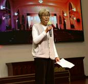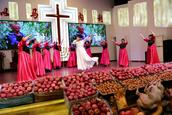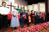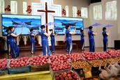 圣洗礼拜圆满礼成之后,赐福教堂负责人朱丽霞教士面带喜乐的笑容登台发表感恩节寄语。她感慨地说:“感谢主!十月是一个感恩的季节、感恩的月份,我们看到圣坛前摆满了丰收的产品,我们看到了又有新人加入我们的教会。我们感谢主赐予的丰年、感谢主的恩典。今天是我们众儿女们迎来了赐福堂第十五个感恩节,我们向主感恩的话说不尽,感恩的歌儿唱不完。”接着她带领大家用赞美的歌颂表示感恩之情。