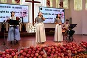 神啊,我们弹琴称谢你,用十弦瑟歌颂你。我们在大会中要称谢你!在众民中翩翩起舞赞美你。在范微教师高唱《收成归天家》的赞美声中,赐福堂2024年的、也是本堂第15个秋收感恩节赞美会拉开了序幕。
