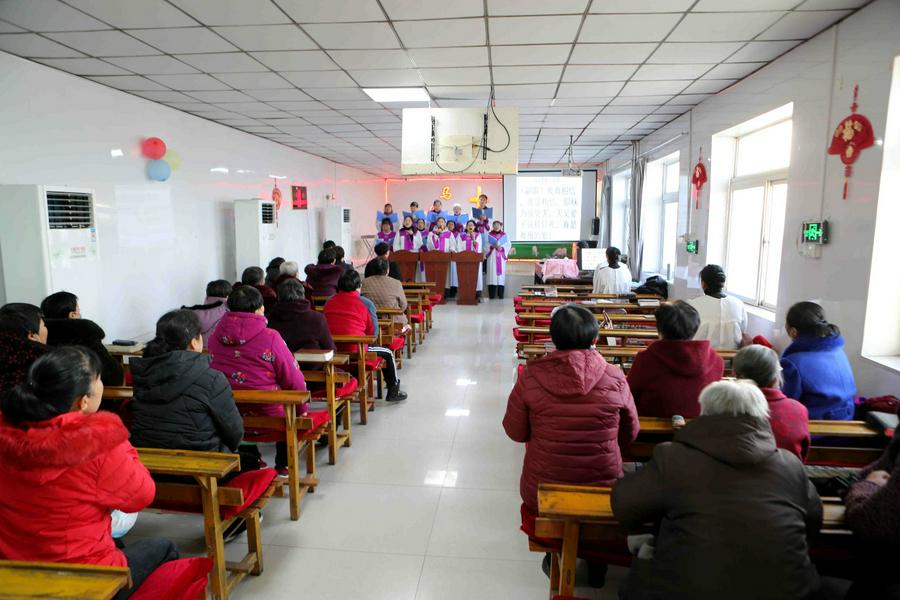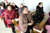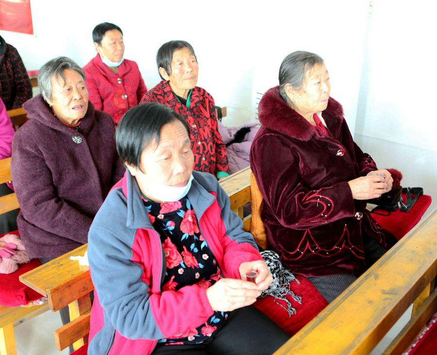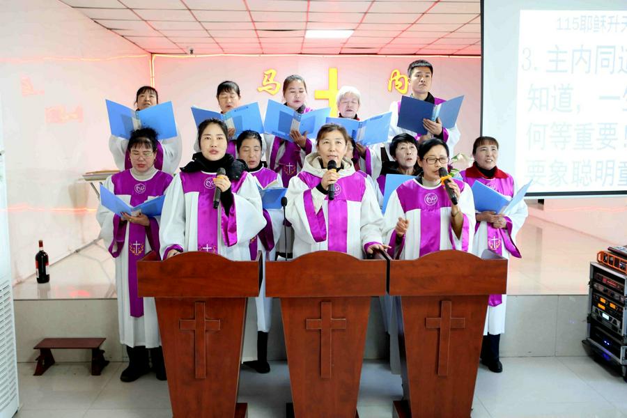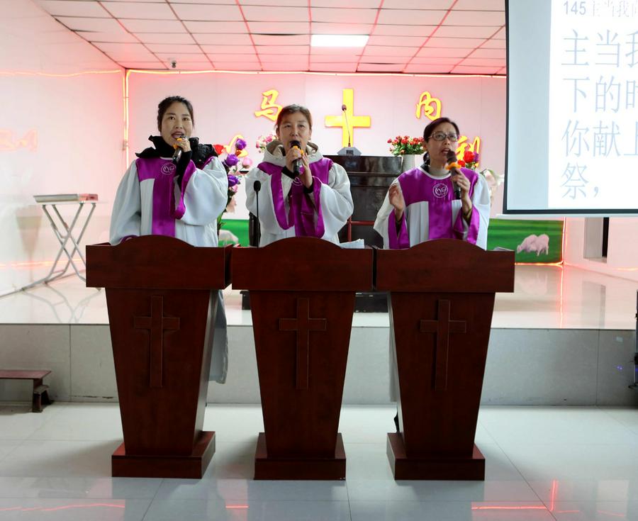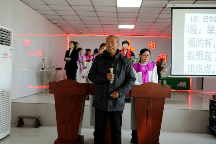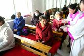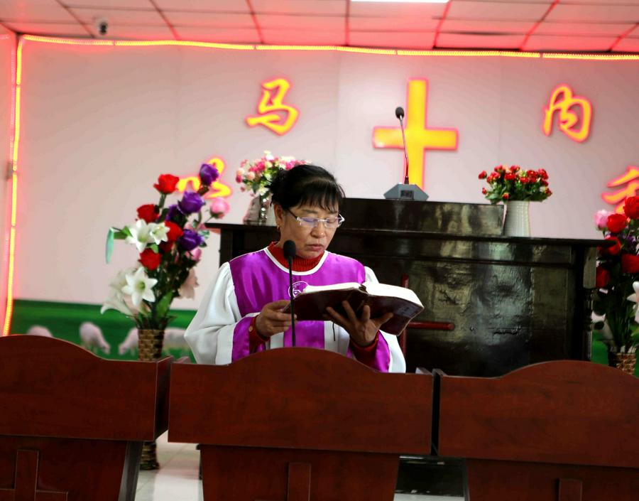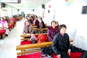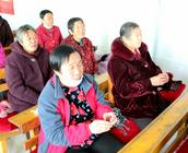 在教堂的主堂,从四乡八屯来的弟兄姊妹坐在温暖的座位上跟随诗班的三位姊妹赞美。基层的活动点由于没有圣职的传道人,所以每年的圣餐礼拜和圣洗礼拜都是有限的。今天前来聚会的肢体比较多,因为大家都很珍惜这年终岁尾的圣餐礼拜。