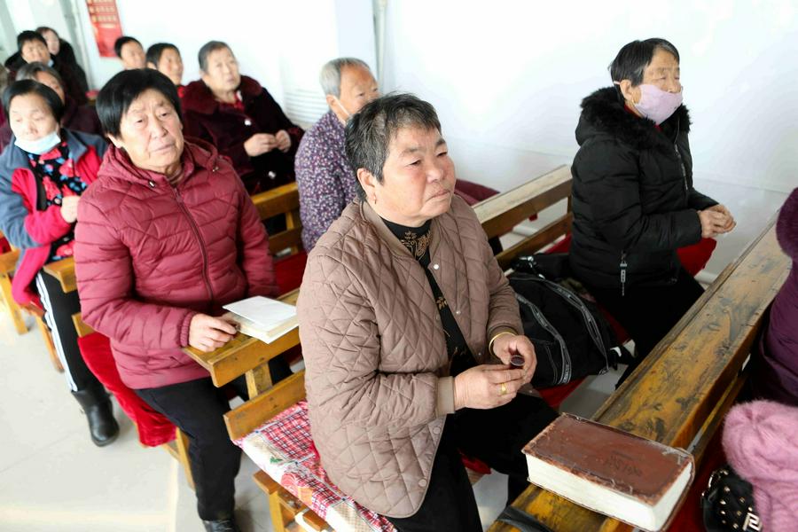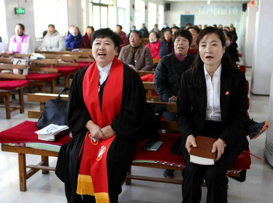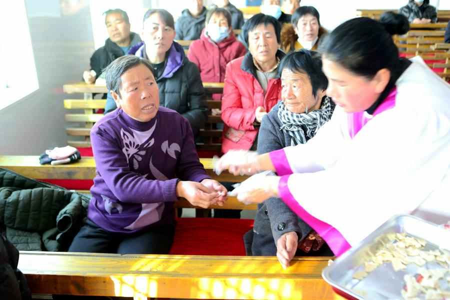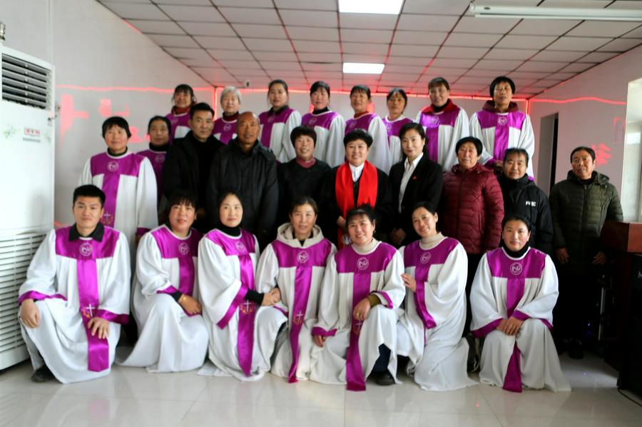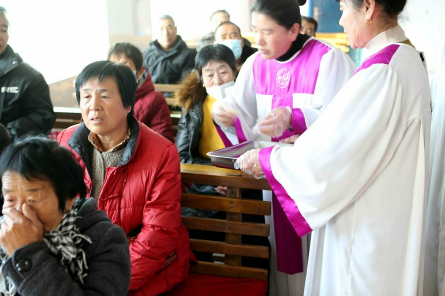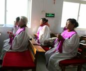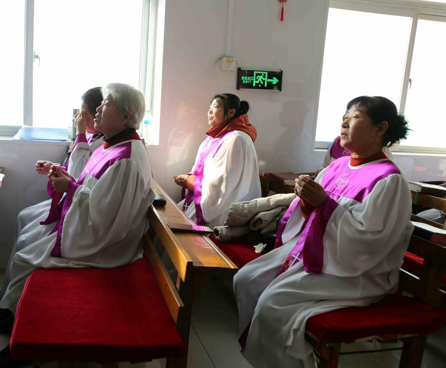在教堂的主堂,从四乡八屯来的弟兄姊妹坐在温暖的座位上跟随诗班的三位姊妹赞美。基层的活动点由于没有圣职的传道人,所以每年的圣餐礼拜和圣洗礼拜都是有限的。今天前来聚会的肢体比较多,因为大家都很珍惜这年终岁尾的圣餐礼拜。