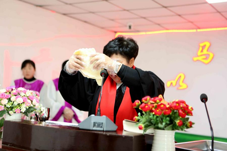 史长老证道后,主持了圣餐礼拜。在诗班反复吟唱的《记念恩主歌》声中,她诵读圣经有关章节,分别为圣餐祝圣,服侍的同工们恭敬接过圣餐,派发给受洗归主的弟兄姊妹。大家在圣诗圣乐中省察自己、认罪悔改,在长老的带领下领受圣餐,体验着与主耶稣基督的亲密联合。