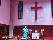 “可以进去吗?”“教会是干什么的?”“我小时候去过,现在要再进去看看。”在接待人员引导下,大家进人了久违的教堂,一楼大厅桌子上摆满了精心预备的各色果盘;进入堂内,一阵阵赞美的歌声令人震撼,宽敞明亮给人神圣庄严的感觉。