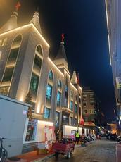 黄昏时分,熙熙攘攘的人群陆续涌入教堂所在的青狮北街的何二胡同,扶老携幼享受愉悦温馨的假期生活。小巷相邻的高墙上赫然写着巨幅具有山西特色诙谐幽默色彩的宣传语“谈恋爱要找山西人谈,画的饼加点醋更好消化”。教堂的四层楼房被灯光照亮,流光溢彩,大红十字架在夜空格外引人瞩目。刚过圣诞,教堂浓郁的节日气氛犹存,闪烁的圣诞树,吸引了年轻人不时拍照留念;可爱的圣诞老人气球“爬” 上了屋顶,“坐”在空调上,令人称奇。