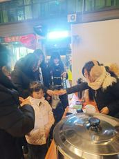 新年好、圣诞的歌声不时声声入耳,吸引着人们鱼贯而入。门口热情的教会服侍人员立即迎上前来,“上帝赐福 ”“新年快乐”“喜乐平安”,一声声亲切的问候使人倍感温暖。这边一杯免费的奶茶已经递到手中,热气腾腾的奶茶令人心里暖暖的,当晚共赠送爱心奶茶千余杯。看到服侍人员手忙脚乱,笔者也加入了队伍,成为一名奶茶师的体验者。