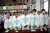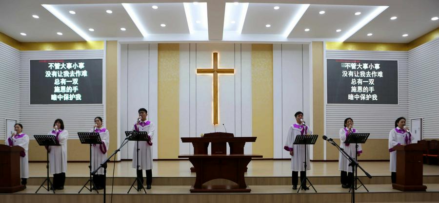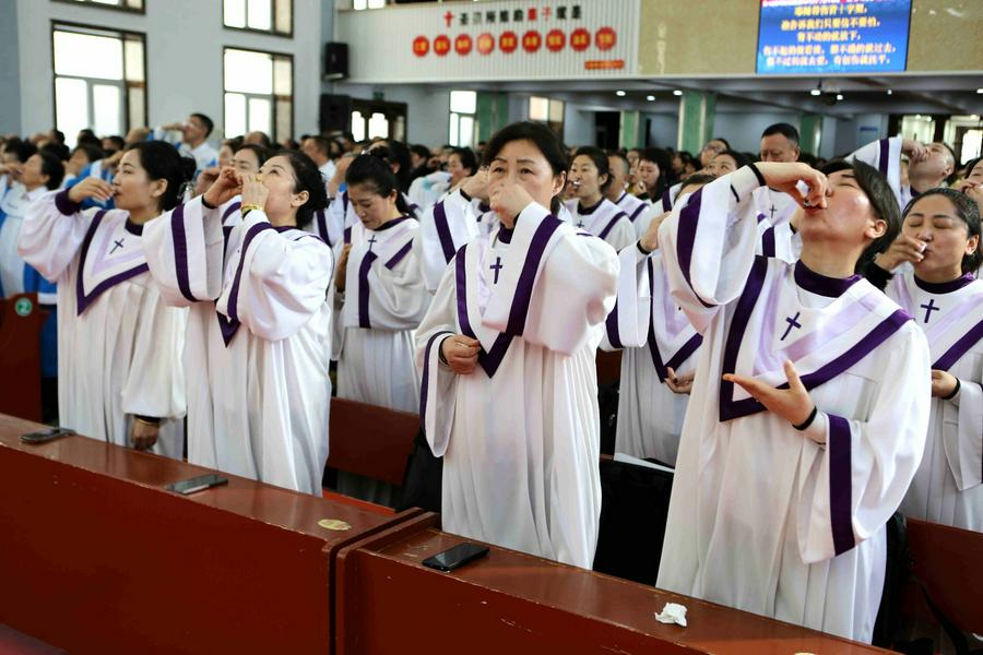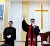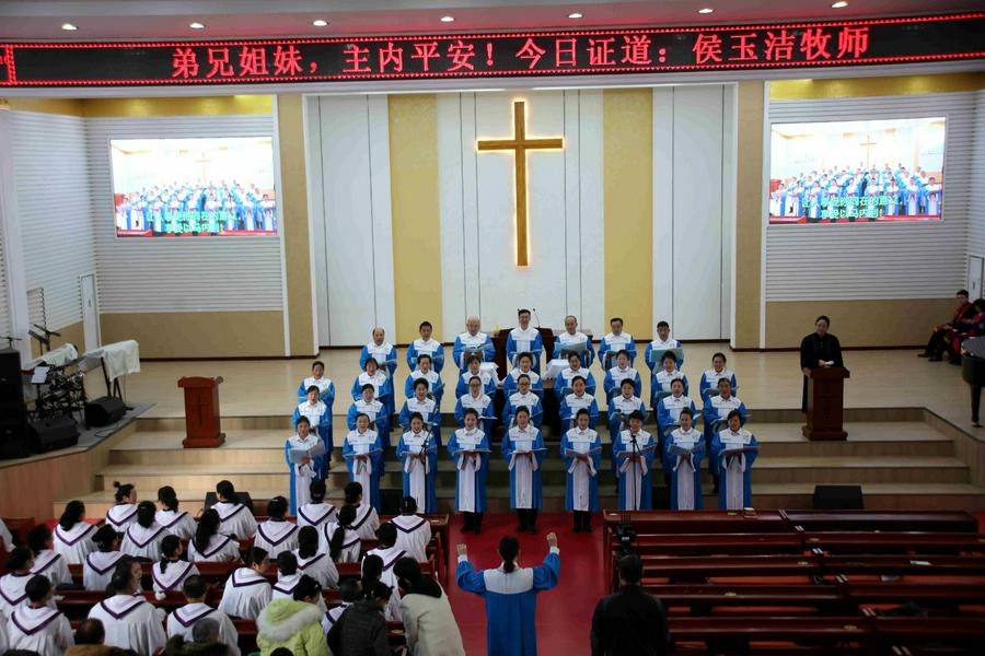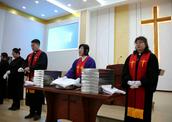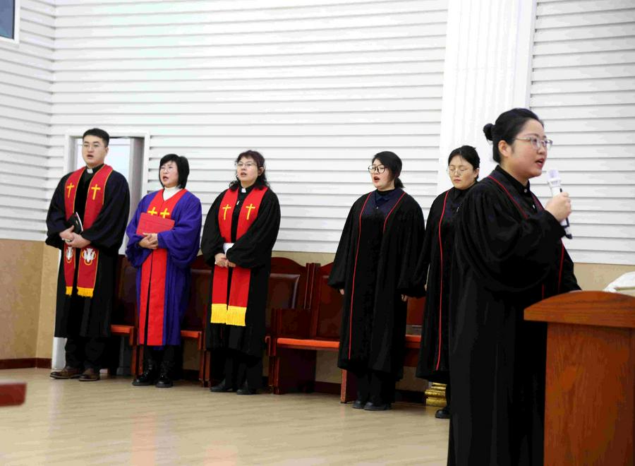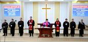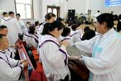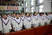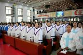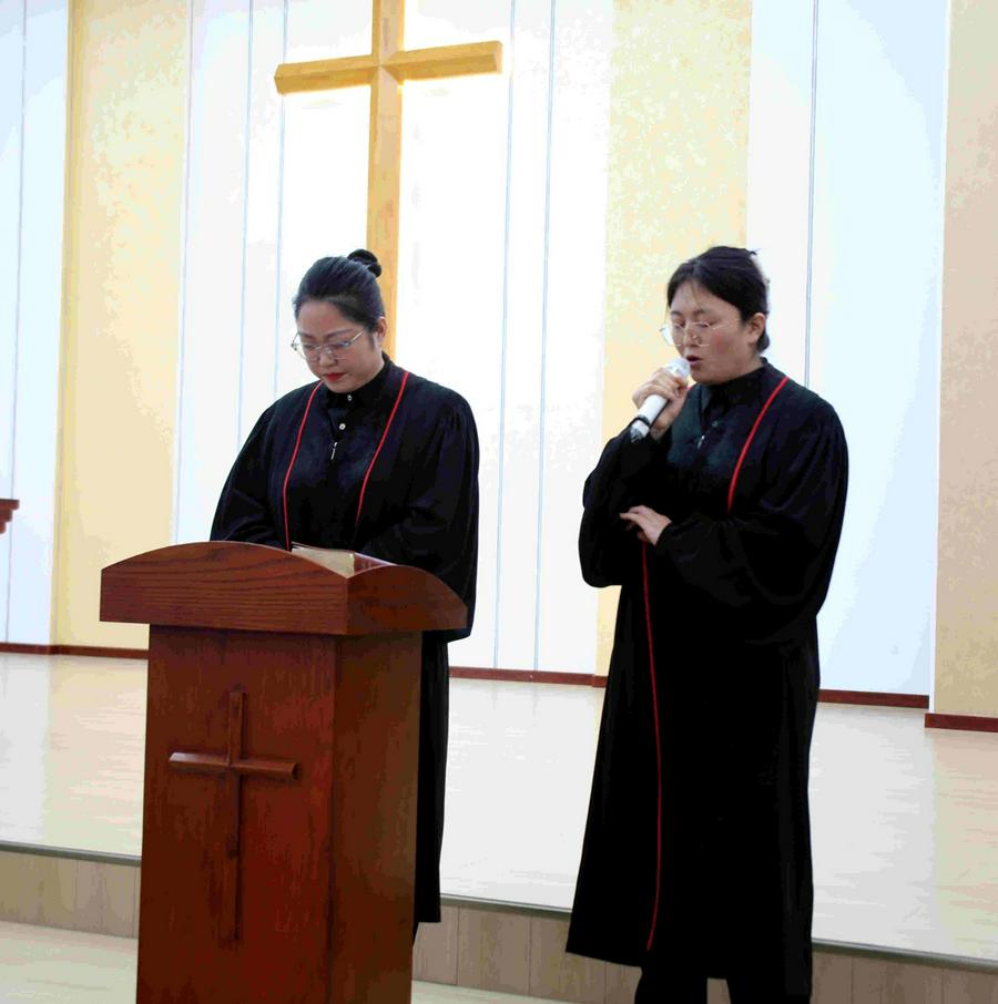 在悠扬、肃穆的圣乐《圣哉三一歌》的歌声中,侯玉洁牧师带领大石桥教堂的侯明牧师、薛金环牧师等各位教牧同工步入圣殿,举行了进殿礼。