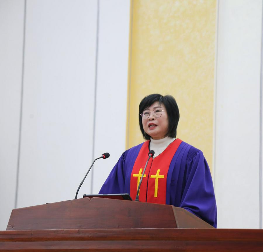 侯玉洁牧师今天身着象征神圣、圣洁、秩序,素有“天堂的颜色”的蓝色圣服,她登上圣台,笑容可掬地问候亲爱的弟兄姊妹在基督里蒙恩、平安。她带领会众恭读圣经诗篇90篇14节、118篇24节、以赛亚书43章19节等经文, 以“新年承受新祝福”为题,分四个方面为主证道:一、愿我们成为贵重的器皿;二、愿我们重新得力;三、愿我们在爱中更新;四、愿我们平安蒙福。她祝愿弟兄姊妹在新的一年中不仅蒙福,而且这份祝福会延续到永远。在证道期间,侯牧师带领大家高唱由她作词的新赞美诗《祝福你》。歌声中充满了对上帝的感恩和对新年的美好期待,参加礼拜的弟兄姊妹感受到了此时此刻恩主耶稣基督就在这里、圣灵的充满就在这里,整个教堂沉浸在一片喜乐与平安的氛围中,弟兄姊妹与前后左右的肢体互致新年蒙恩的祝福,三一真神上帝的慈爱、肢体的彼此相爱就在这里。