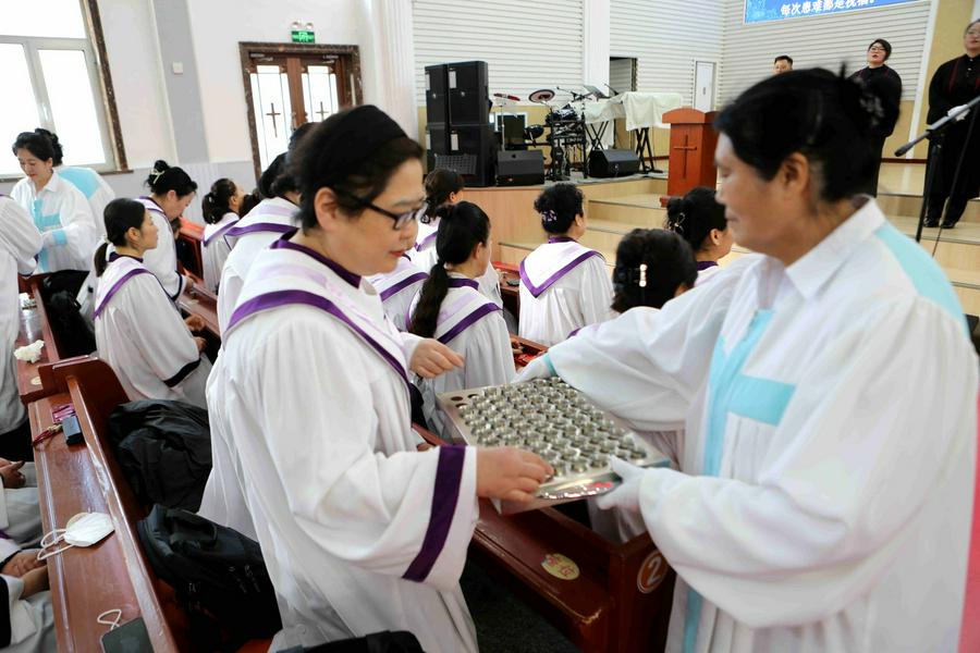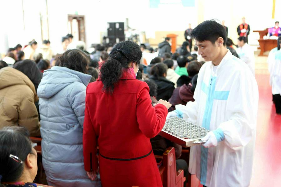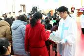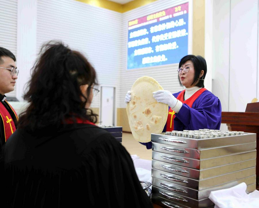 证道结束后,大石桥教堂举行了新春佳节后的第一场圣餐礼拜。侯玉洁牧师主礼,侯明牧师、薛金环牧师襄礼,共同完成这一庄严的圣礼。侯玉洁牧师手持圣餐饼、举起杯,饱含感恩的深情,用温柔而坚定的声音,带领会众回顾耶稣基督在最后晚餐中设立圣餐的时刻。擘饼、举杯,将饼和杯分别祝圣,服侍的同工们恭敬地接过圣餐,小心翼翼地将它们传递给每一位信徒。同工在分发圣餐的过程中,提醒每一位信徒:“这是主的身体,为你们舍的;这是主的宝血,为你们流的。”声音中充满了感恩。信徒们敬畏地起立感谢主,接过圣餐,在诗班吟唱的“主你的肩上背着沉重的十字架,有谁能理解你当时的心情和忧伤。主你的身体,血肉模糊遍体鳞伤,有谁能理解,你的孤单无助和哀伤”的歌声中,各自默祷,省察自己的罪,预备心灵,在牧师的祷告中、在这神圣的时刻领受了圣餐。