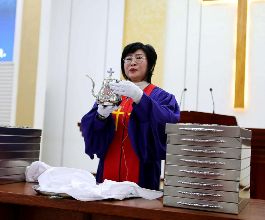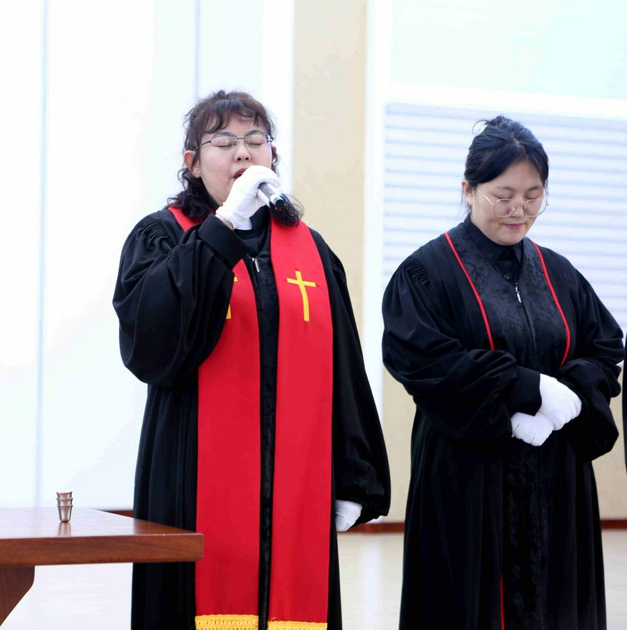 随后,薛金环牧师为圣餐礼拜进行谢恩祷告。她神情庄重,用诚挚的心声向天父献上感恩与祈求。她感谢上帝通过圣餐的恩典,让信徒们再次感受到主的同在与祝福。