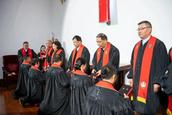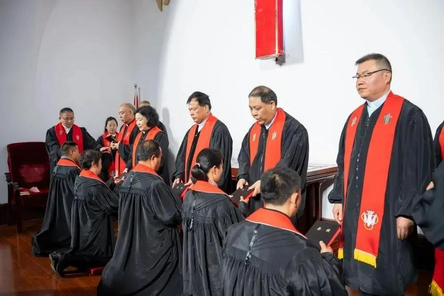 圣职按立礼由王孟坤牧师主礼,高明牧师致辞,赵克玉主任引荐同工,汤泉、史燕萍(女)、闫海燕(女)、赵蒙蒙(女)被按立为牧师;高维军、于红文(女)、于纯友、张汉芳(女)、何道刚被按立为长老。