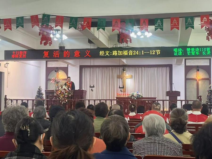 一场感恩、欢庆的聚会正在拉开帷幕。中国基督教三自爱国运动委员会副主席、辽宁省基督教三自爱国运动委员会主席史爱军长老登上圣台,脸上洋溢着亲切而温暖的笑容,他向在场的弟兄姊妹们致以复活节的喜乐问候。随后,他引领着会众诵读路加福音24章1—12节的经文。每一个字句都如同圣洁的音符,在教堂内回荡,信徒们跟随着经文的指引,沉浸在对复活节意义深刻的思索之中。
