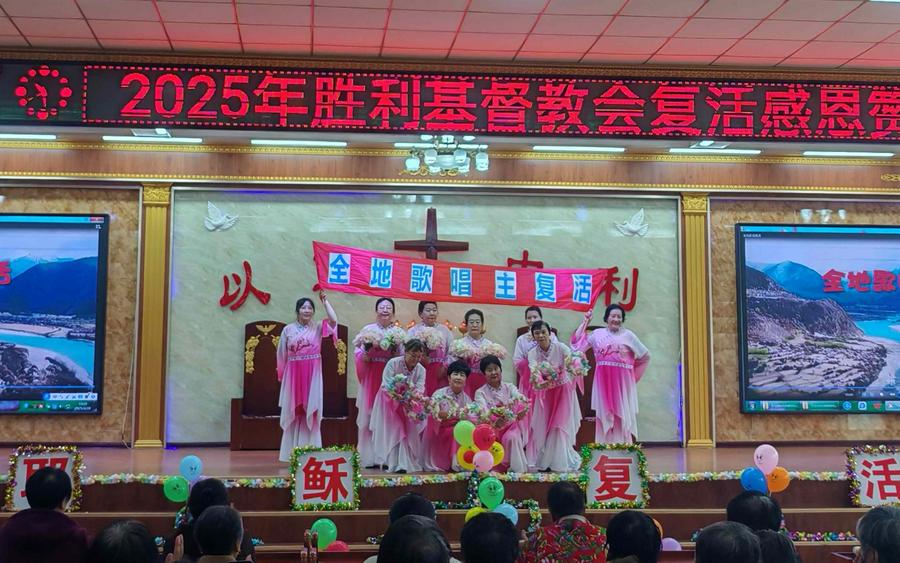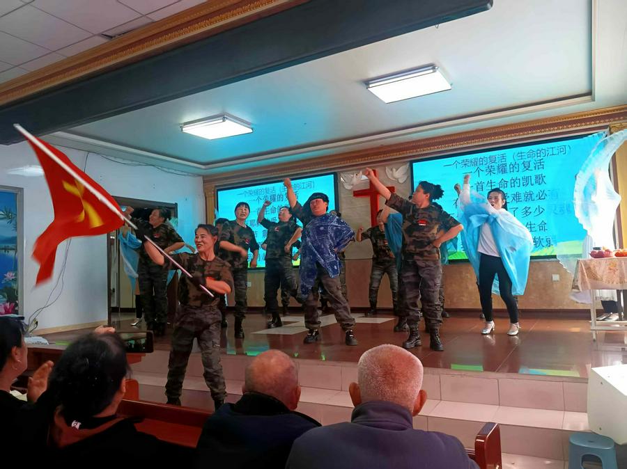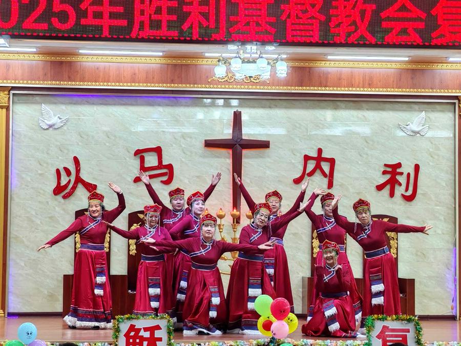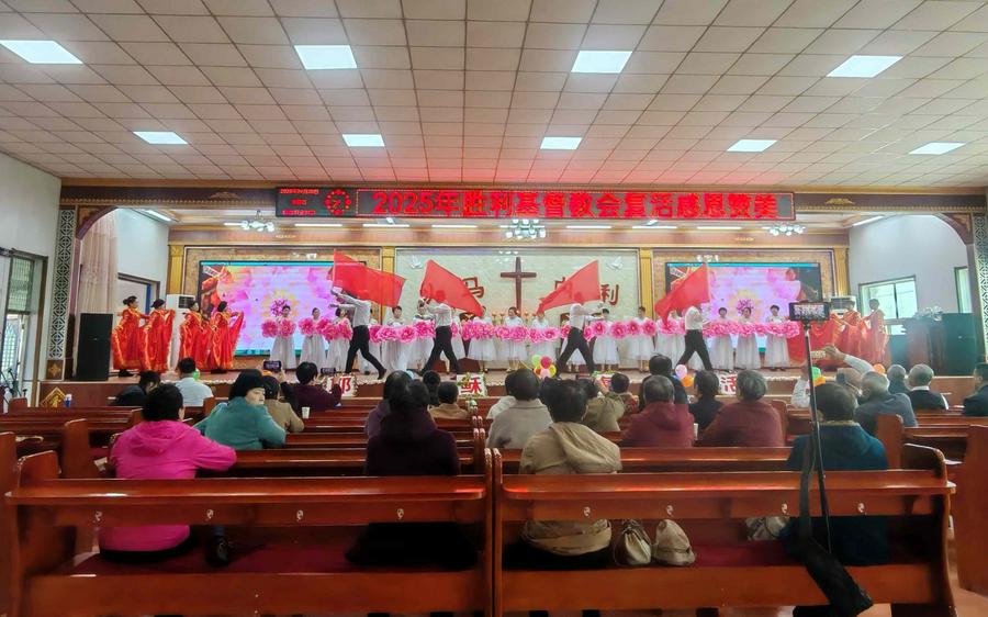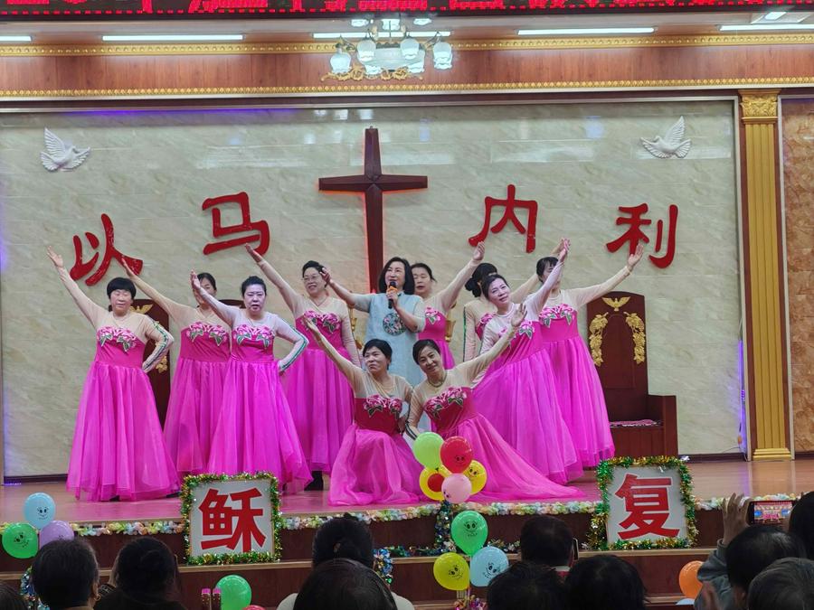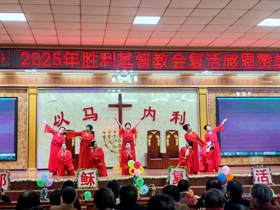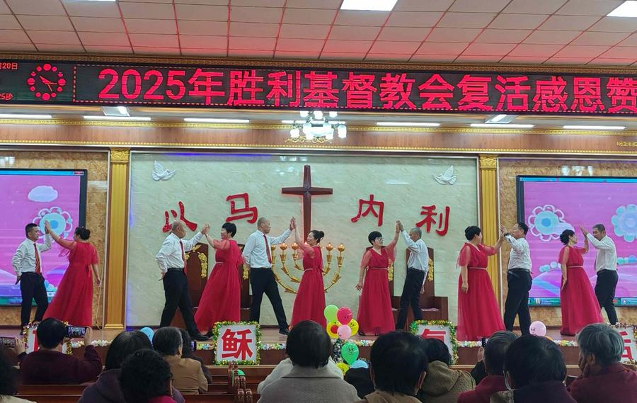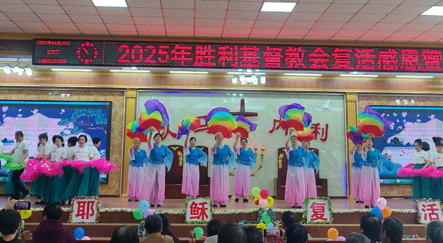 今天的胜利教会的舞台上,向主献祭的弟兄姊妹身着节日的盛装,载歌载舞表达了对主耶稣基督复活的感恩之情、赞美之心。