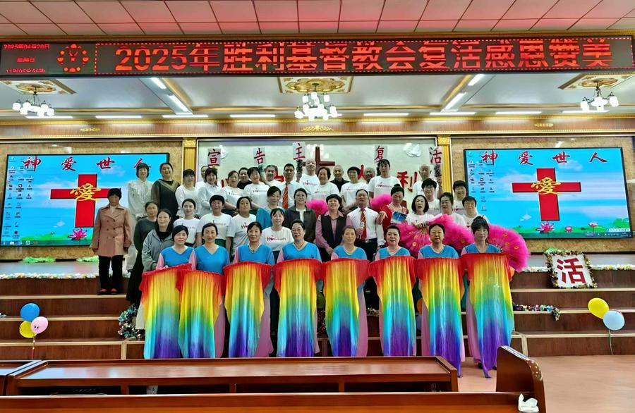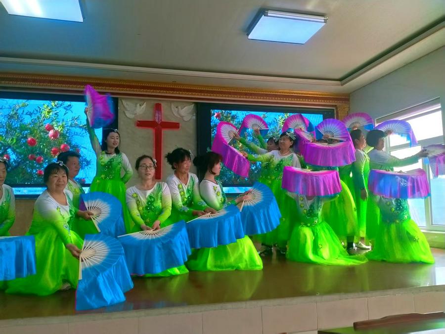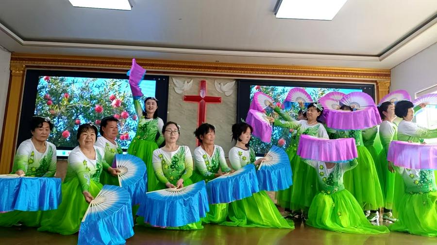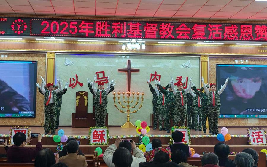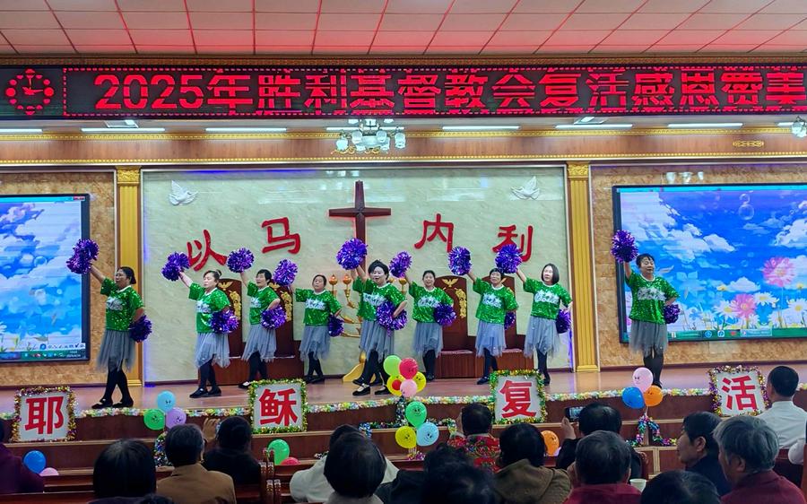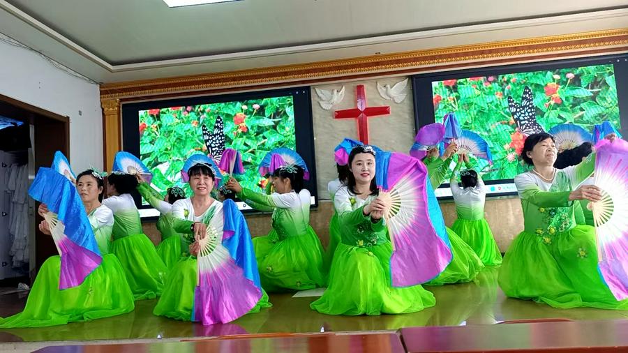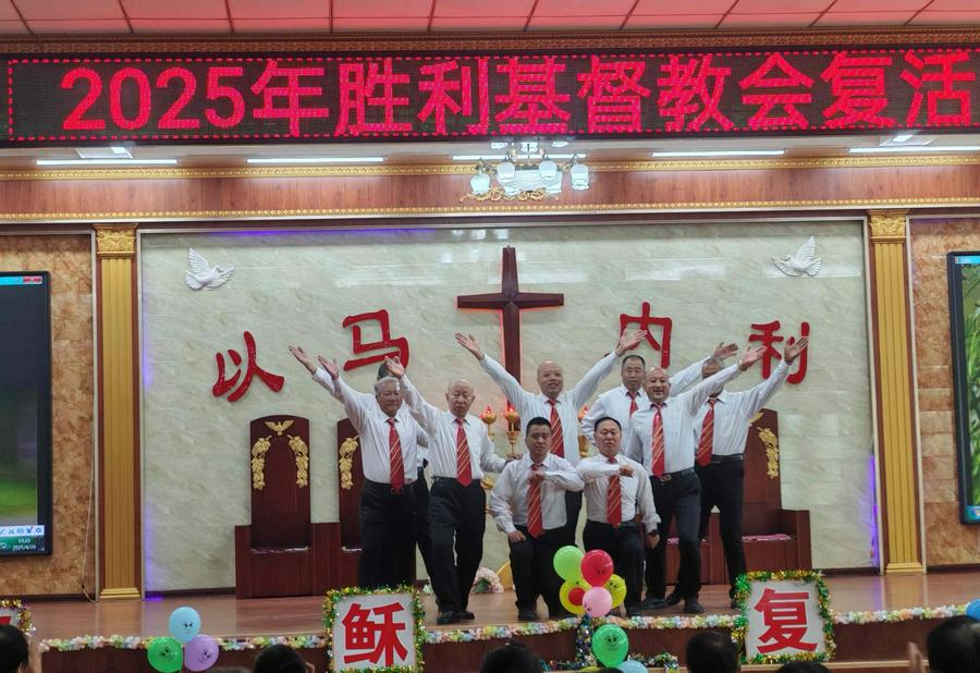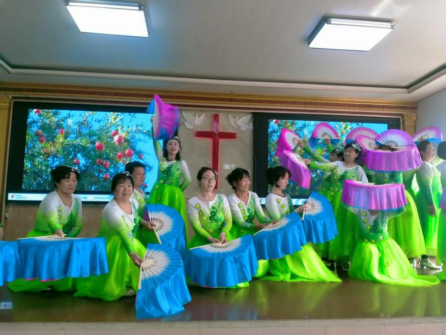 今天的胜利教会的舞台上,向主献祭的弟兄姊妹身着节日的盛装,载歌载舞表达了对主耶稣基督复活的感恩之情、赞美之心。