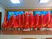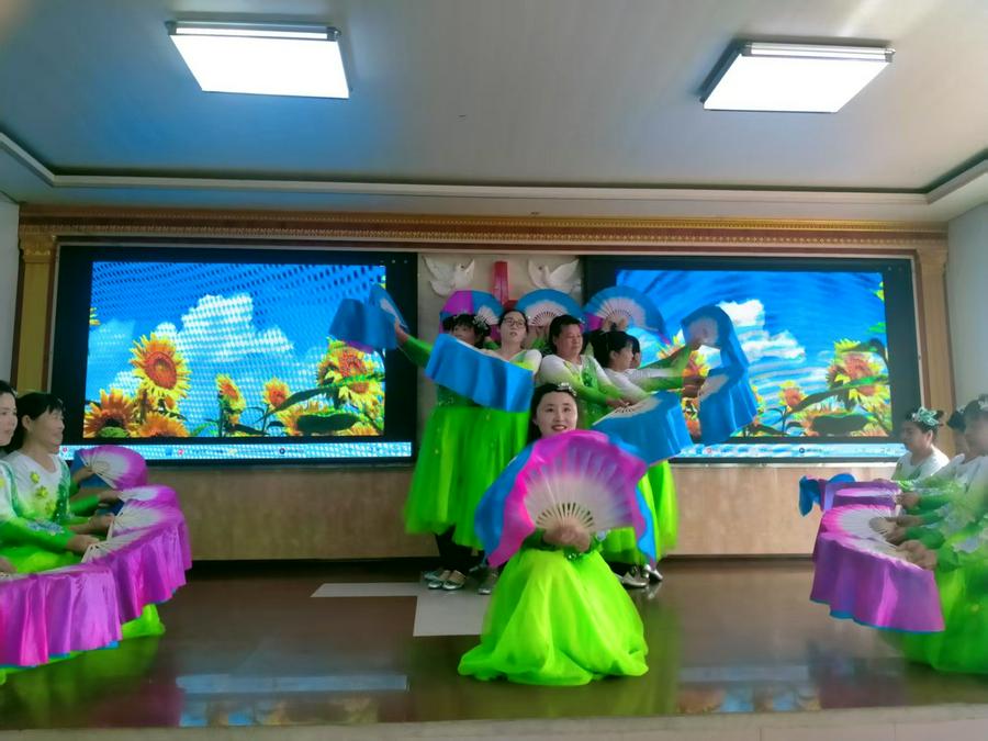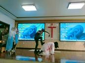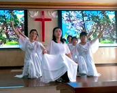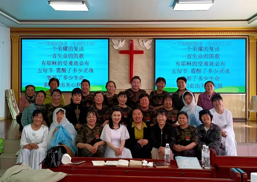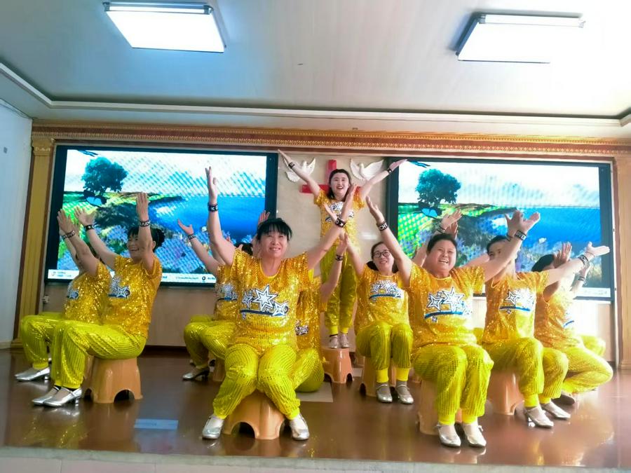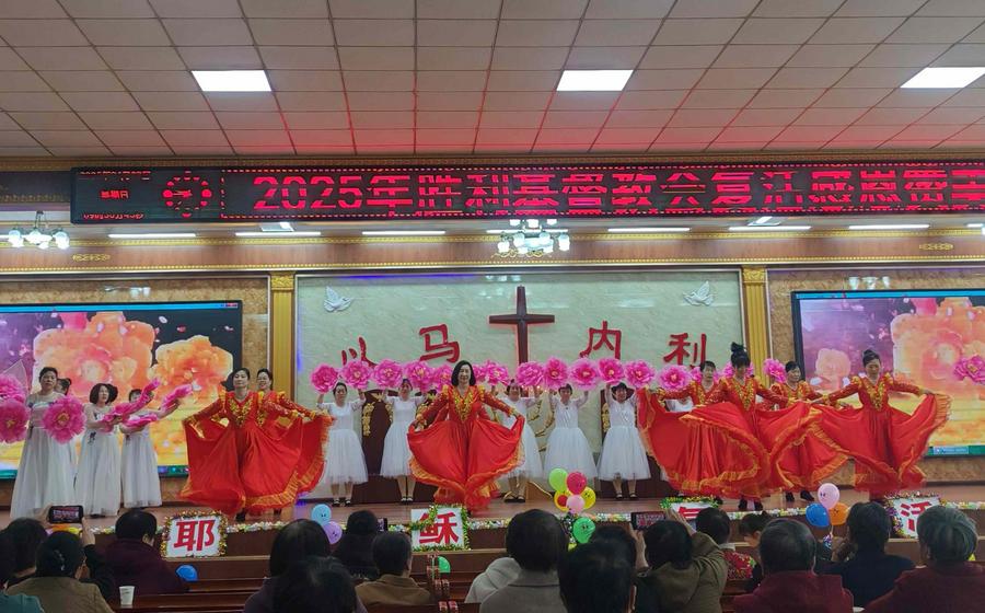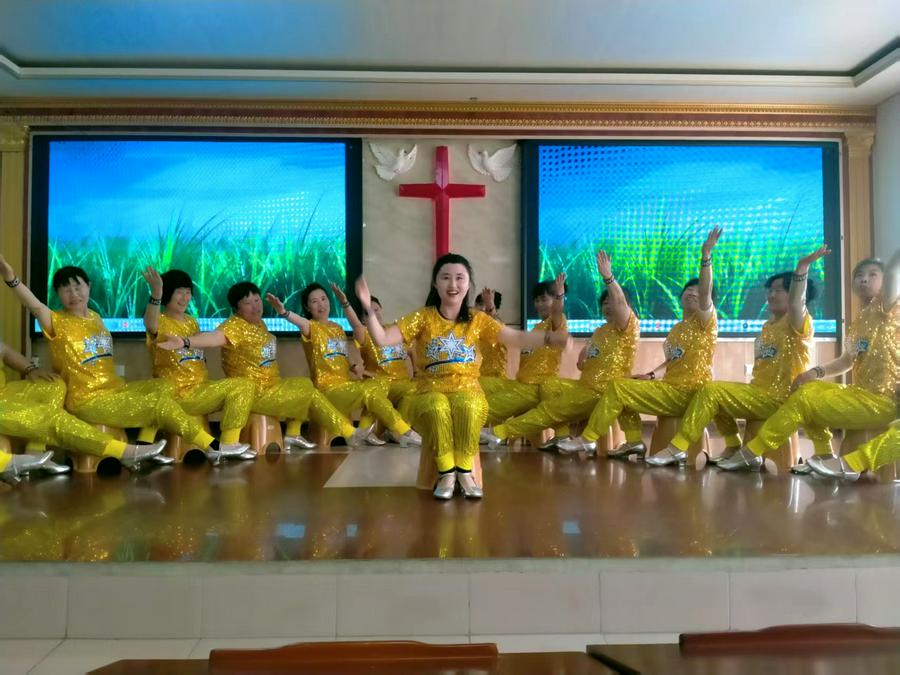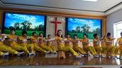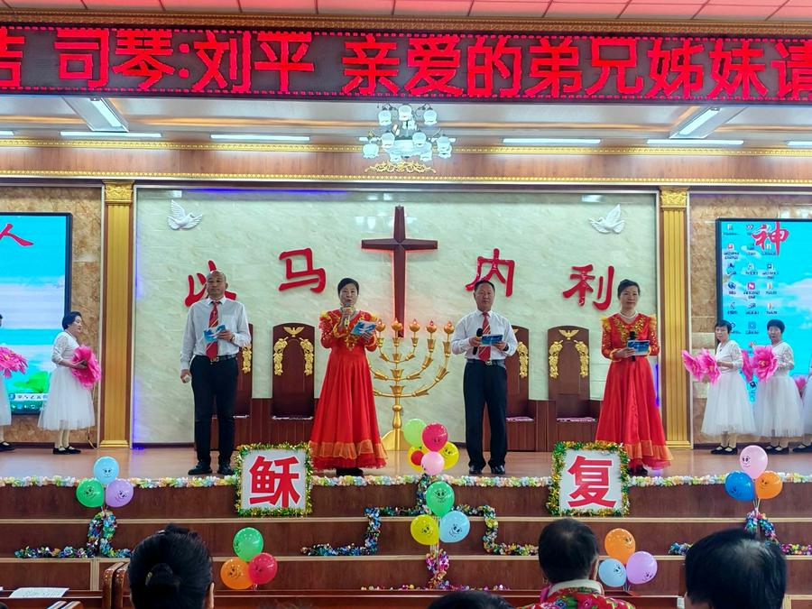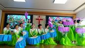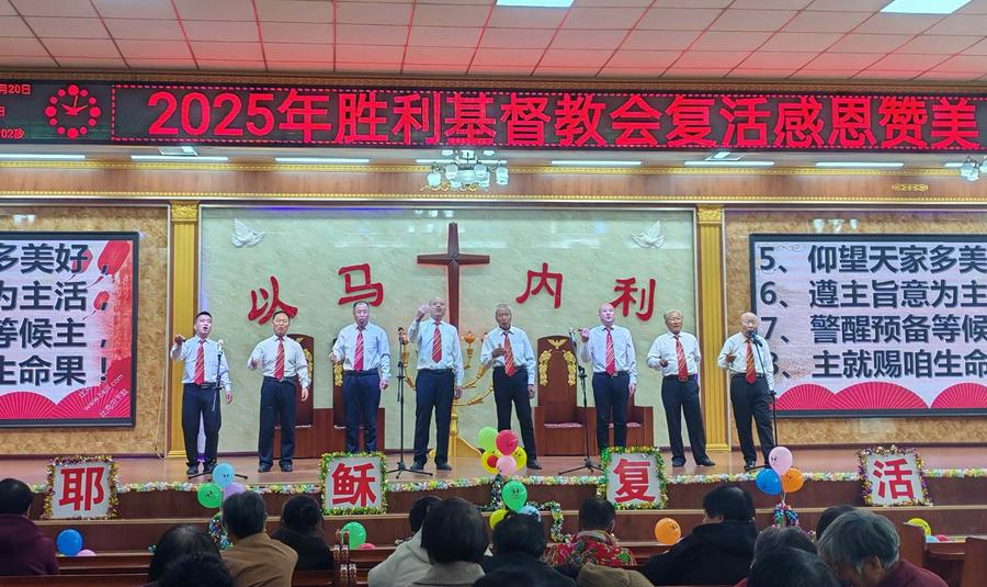 今天的胜利教会的舞台上,向主献祭的弟兄姊妹身着节日的盛装,载歌载舞表达了对主耶稣基督复活的感恩之情、赞美之心。