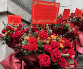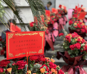 崇一堂主堂正前方十二级阶梯两侧,摆满来自浙江各地弟兄教会和机构赠送的花篮,包括浙江省基督教两会、宁波、慈溪、温岭、台州等地基督教两会、教会,杭州市各区教堂、聚会点,以及杭州青年会、女青年会等。