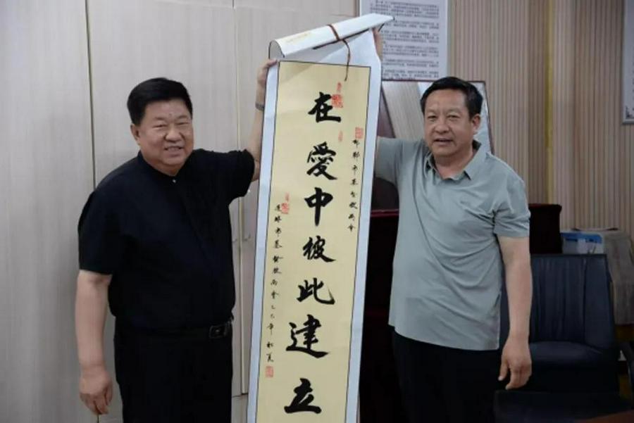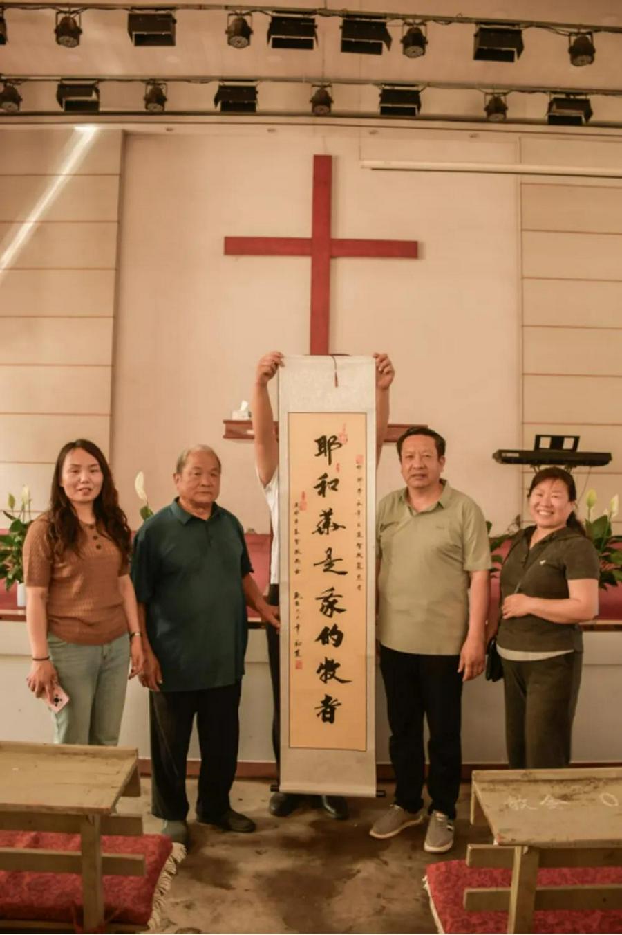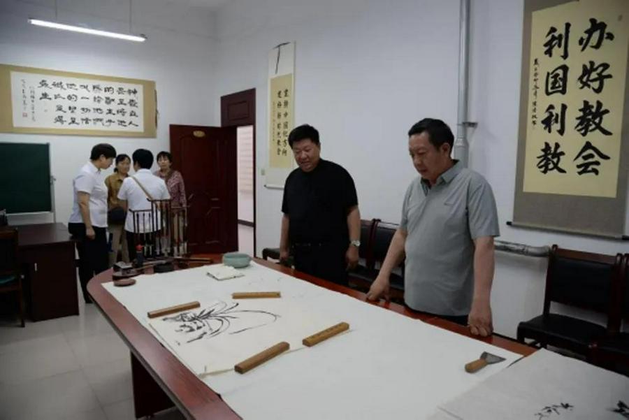 在邯郸北堂,河北省基督教协会会长、邯郸市基督教两会主席、会长刘玉文牧师接待大家并介绍了邯郸基督教在推进宗教中国化方面的做法和经验,同工们饶有兴致的参观了北堂具有中国传统文化特色的书画室,互相赠送了具有基督教中国化特色的书法作品、邯郸成语等礼物。