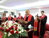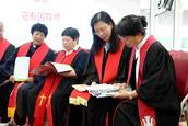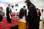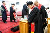 上午九时整,献堂感恩崇拜在圣洁的期盼中拉开帷幕。 来自大连各兄弟教会的牧长、长老等嘉宾身着圣洁的礼服,在悠扬而庄严的圣诗与圣乐声中,以敬畏之心缓步进入焕然一新的主堂,进行了神圣的进堂礼,昭示着新殿敬拜生活的开端。