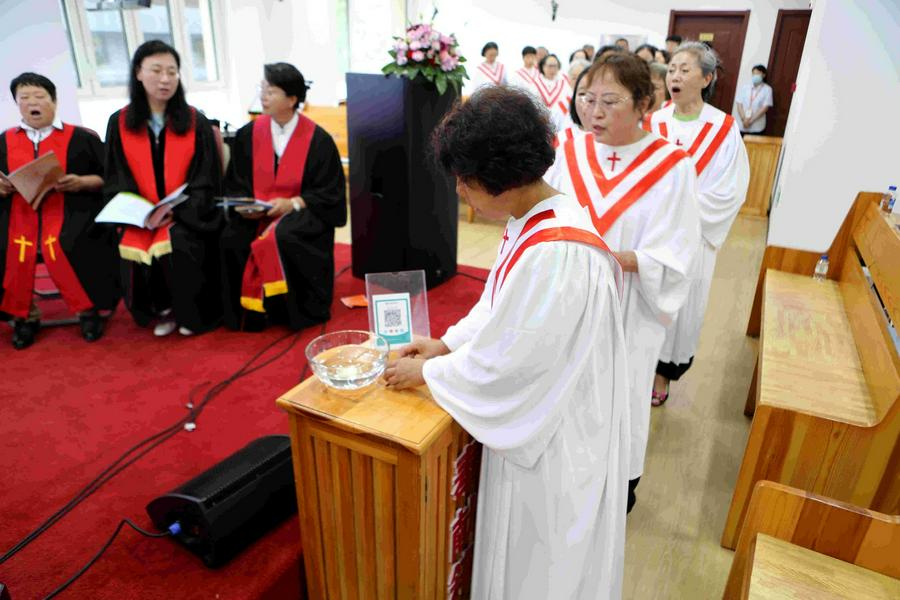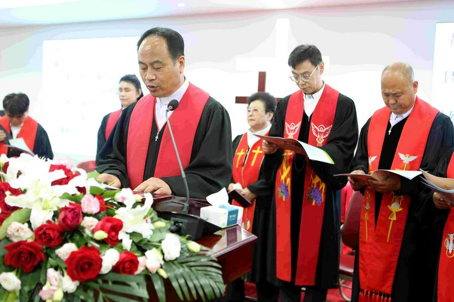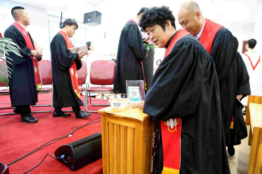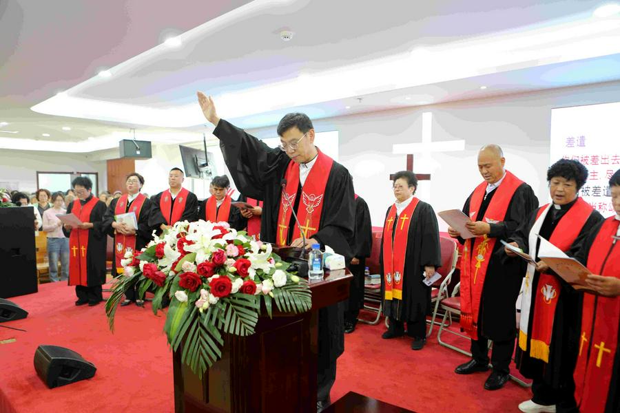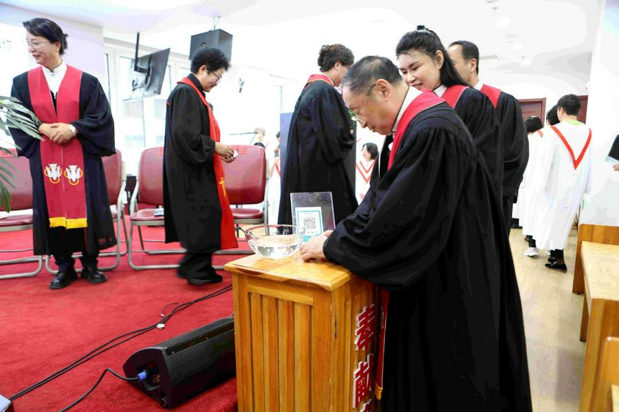 “奉主名将这清水洒在你们身上,你们就洁净了。” 在寇有国牧师的主持下,全体教牧同工与会众共同参与了极其庄严的献堂“洒水礼”,此时此刻,在圣台前的所有牧长集体举手,为“洒水礼”祷告、祝福。清水洒落,象征着洁净、更新与圣灵的充满。随后,宋永红长老代表会众向三一真神上帝献上深切的代求。圣诗班再次以嘹亮清澈的歌声高声颂扬《哈利路亚》,将赞美推向顶峰。在平安的问候声中,教牧同工与弟兄姊妹们互道平安(平安礼),殿内充满了在主爱里彼此联结的温暖。