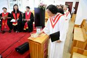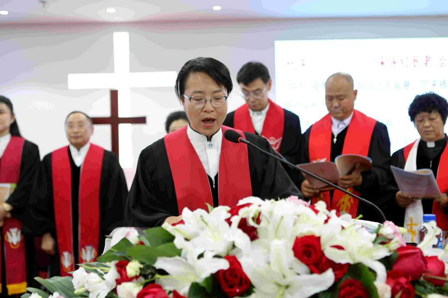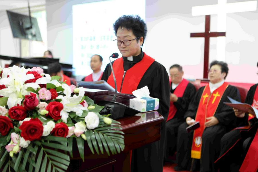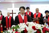 在《圣哉三一歌》那令人肃然起敬的赞美旋律中,崇拜进入祝圣环节。特邀的周淑萍长老、于慧君长老、赫修军长老在圣台,代表众教会为这座新殿和在此举行的首次感恩崇拜祝圣、施礼。他们恳切带领会众崇拜祷告,称谢、赞美三位一体的真神上帝,将荣耀全然归给至高者。