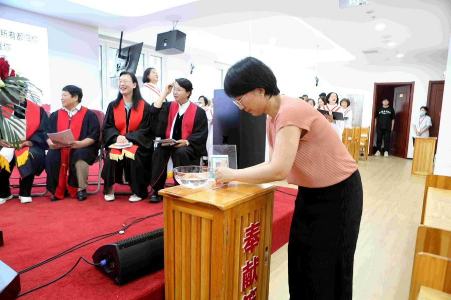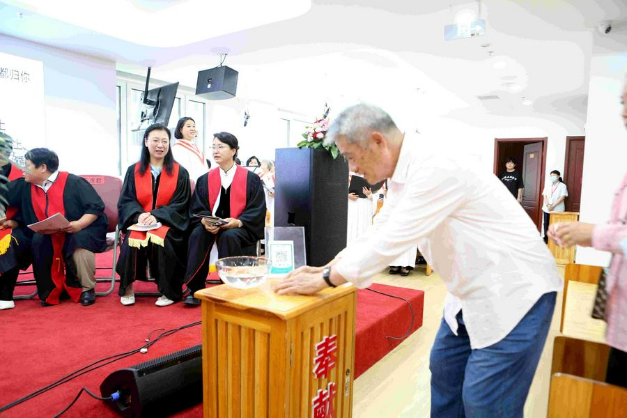 “物都是从主而来,凡我们所有的都属于主,我们感谢主,并乐意把从主而来的奉献给主。”寇牧师证道之后,在《我爱中国教会歌》与《一切全献上》这两首表达深沉委身之情的崇拜诗歌伴随下,庆典迎来了一个感人至深的高潮环节:献堂奉献礼。李绪清长老为此郑重祝祷。此刻,全场会众在主礼人田成斌主任牧师的带领下,参加庆典的众教会嘉宾牧师、长老以及全体弟兄姊妹,怀着一颗颗感恩的心,依次有序地走向奉献箱,将自己对神的感恩与敬虔的祭物献上。场面庄重而火热,许多人眼中闪烁着感动的泪光,充分彰显了神家儿女同心合意、甘心乐意的奉献之心。