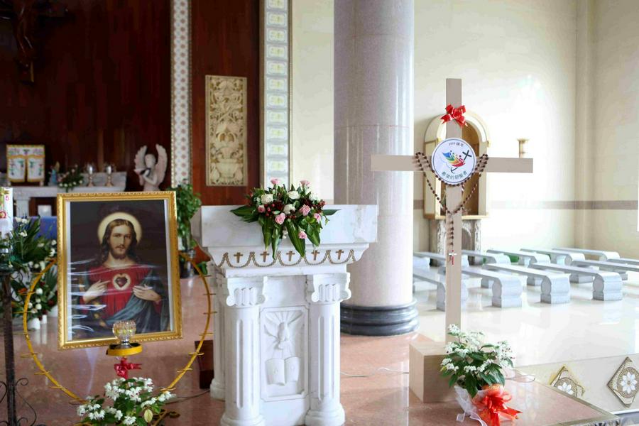 主教府教堂特色元素:教堂大门由越南工匠用千年格木精雕而成,高7米、宽4米、厚12厘米,重达2.8吨,雕刻有天主圣三、圣伯多禄、圣保禄及天使像,被誉为“中国教会第一门”。