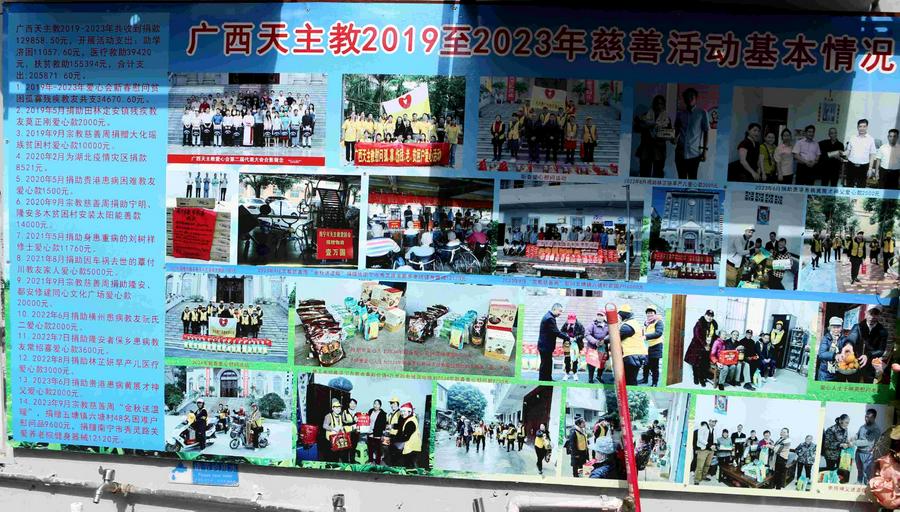 透过主教府的宣传资料我们得知,广西天主教积极参与主内和社会的慈善公益活动,荣神益人,据不完全统计:2019—2023年共收到捐款129858.50元;开展活动支出:助学济困11057.60元,医疗救助39420元,扶贫救助155394元,合计支出:205871.60元。其中: